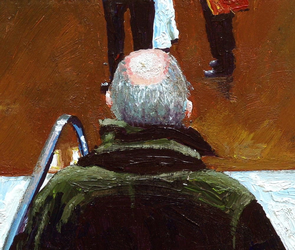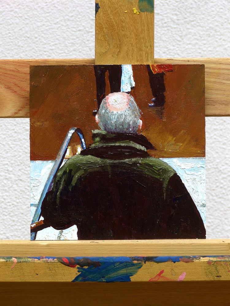 Gerard Boersma est connu pour ses peintures de personnes dans la rue, dans les magasins, les transports en commun et les musées. Cette oeuvre de 15 x 15 cm montre un homme sur un escalator dans un centre commercial.