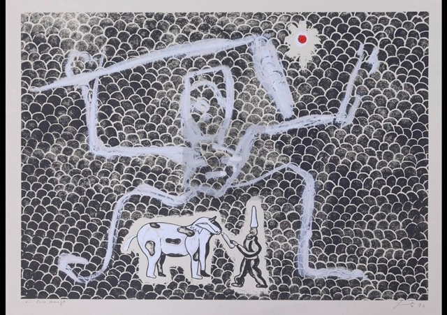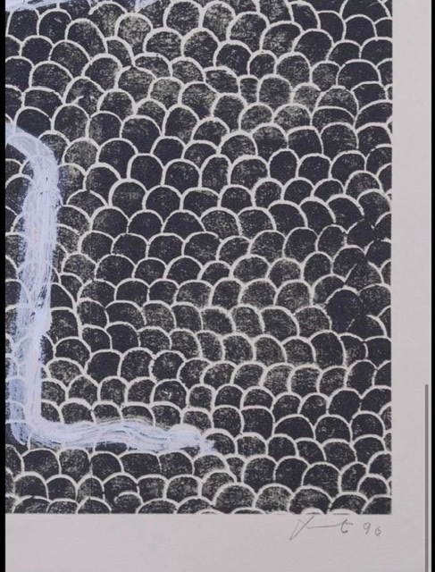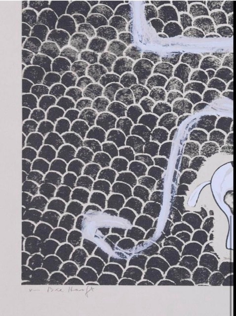 L'oeuvre est signée à la main en bas à droite et un message personnel à gauche "pour.."