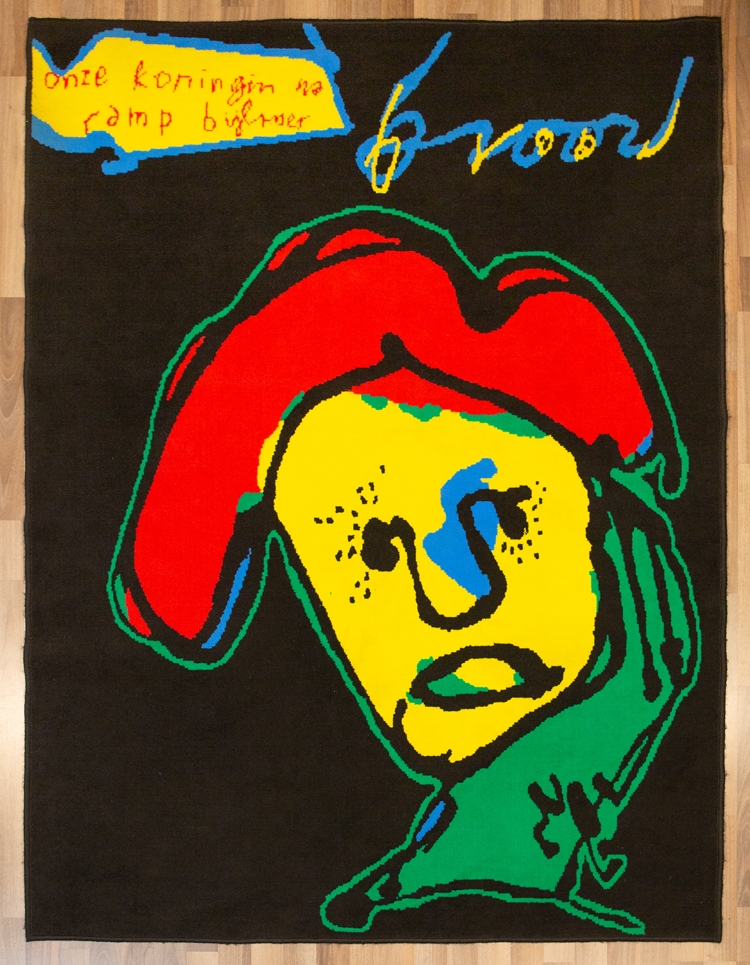 Tapis avec une photo d'Herman Brood, intitulé "Notre reine après le désastre Bijlmer". Dimensions 183 cm x 137 cm. État: bon état avec de légères traces d'usure et une marque de brûlure (voir photo 5).