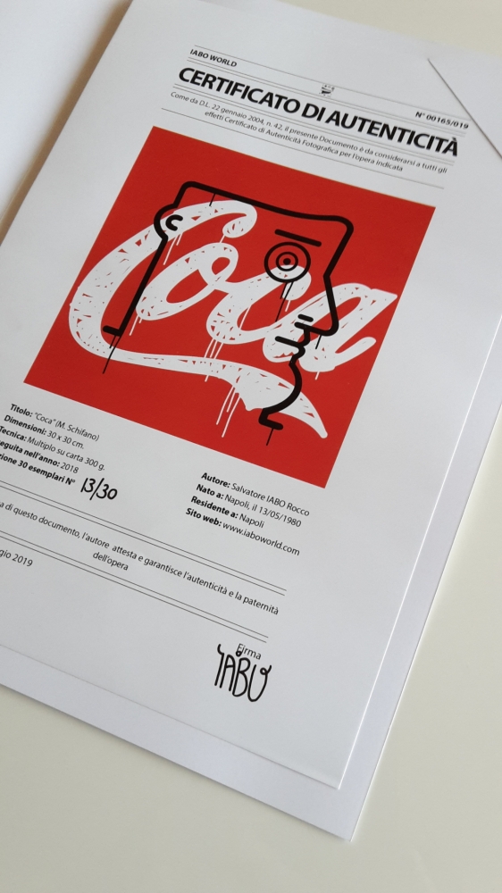 Impression numérique sur papier Fedrigoni 300g. Tirage limité à 30 exemplaires dont celui-ci est le numéro 13. Dimensions hors tout : 30 x 30 cm. Estampillé, numéroté et signé à la main par l'artiste avec certificat d'authenticité (COA). La liste n'est pas inclusif. A première vue, IABO (Naples, 1980) s'inspire du pop art des années 1980. Il explore la ligne et étudie sa forme. Et il en fait une véritable obsession, suite à une recherche constante de perfection mécanique, mais de manière artisanale. En IABO, la frontière homme/machine est très mince. Ses créations sont techniquement parfaites. Une obsession qui l'a conduit à expérimenter et à configurer un langage très personnel.