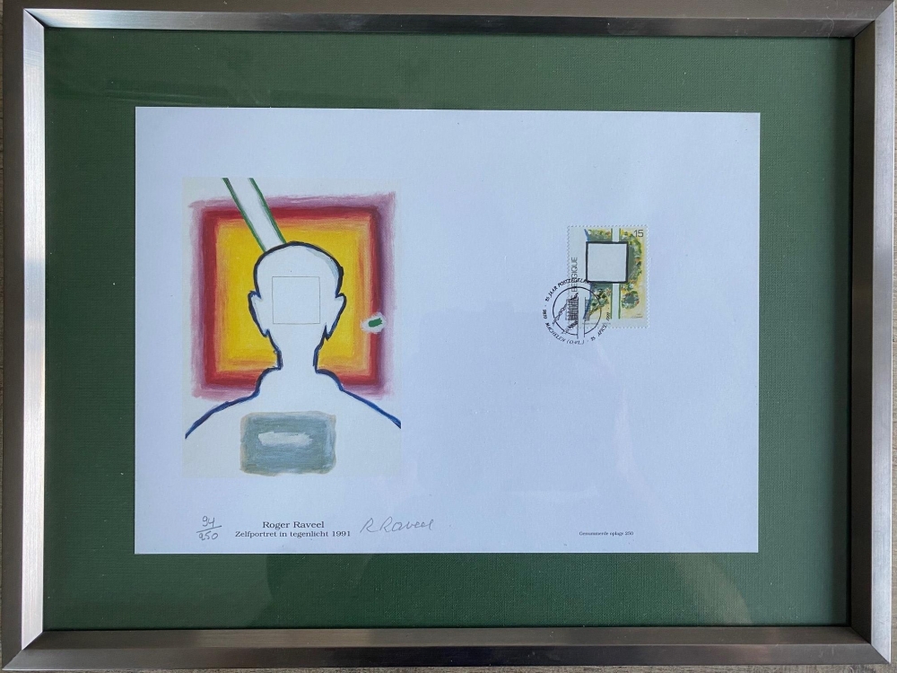 Un tampon dessiné par Roger Raveel appliqué sur un tirage offset de "Portrait rétroéclairé".