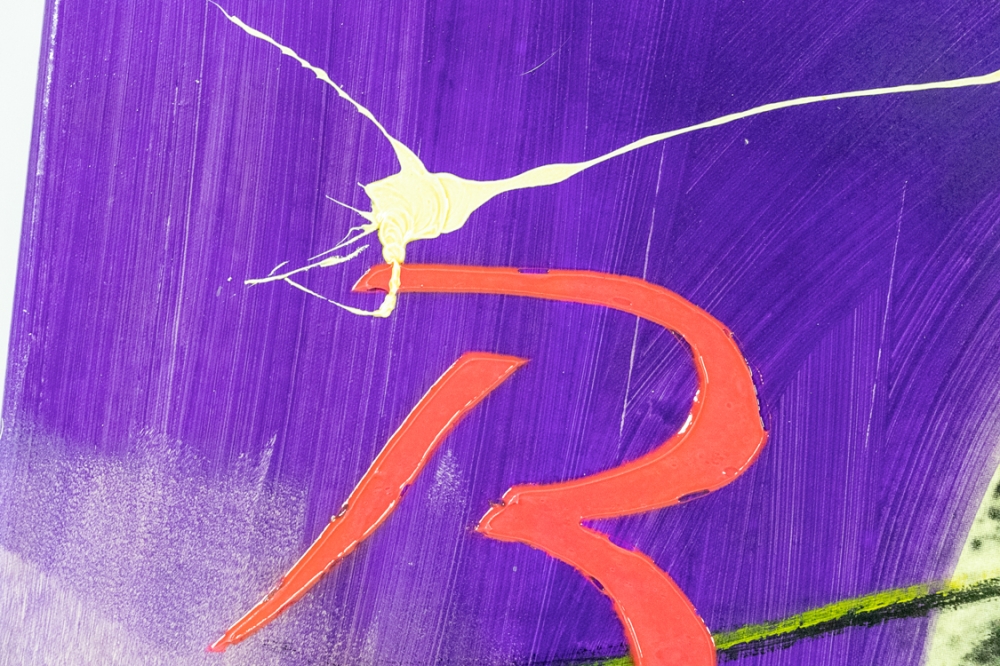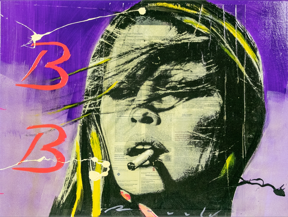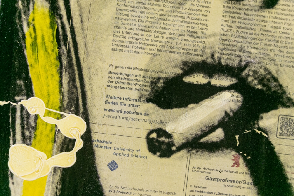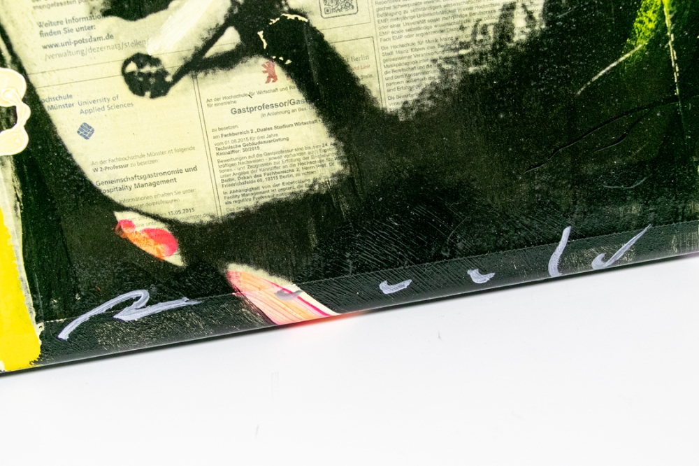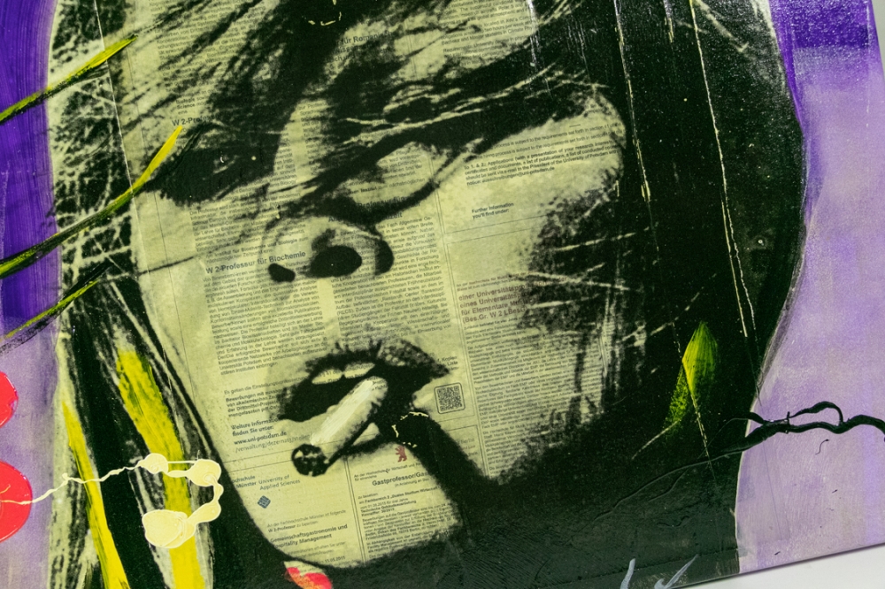 uvre de techniques mixtes de Ronald Chapeau, l'artiste complète des coupures de journaux et des impressions avec de la peinture acrylique sur toile.