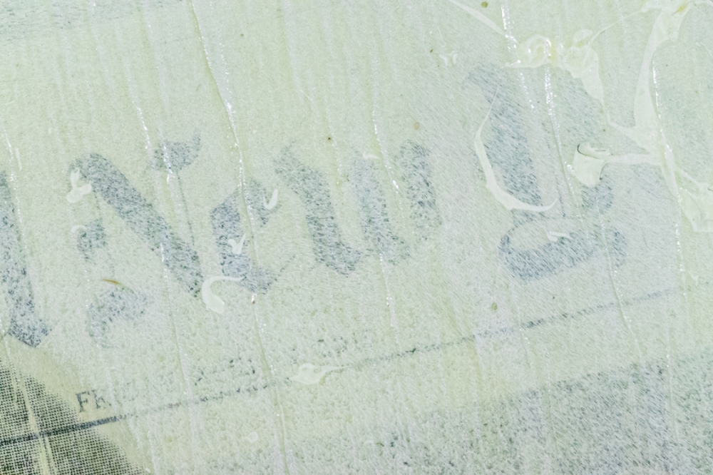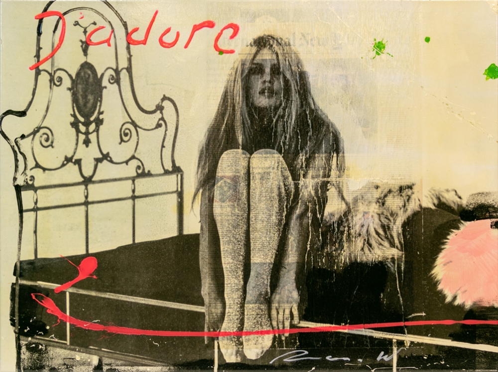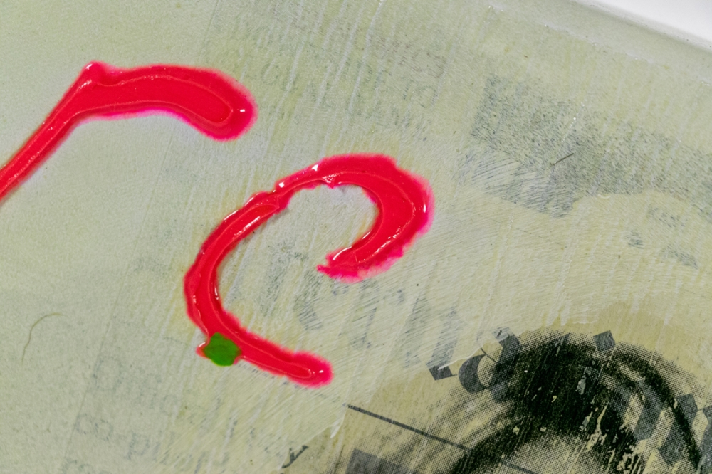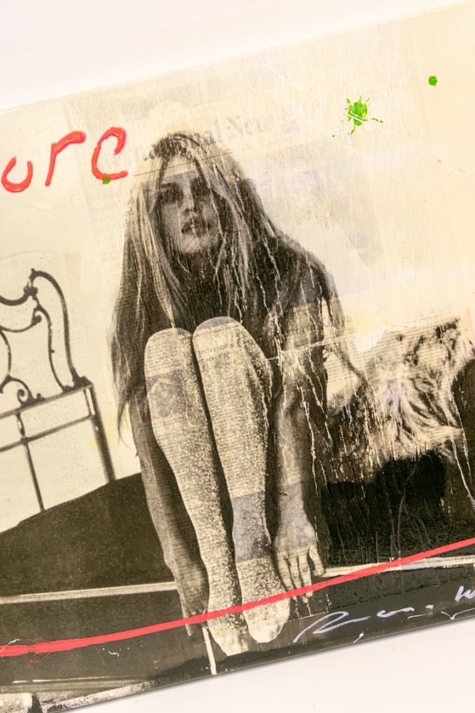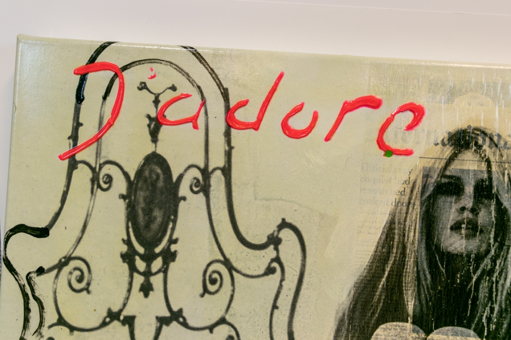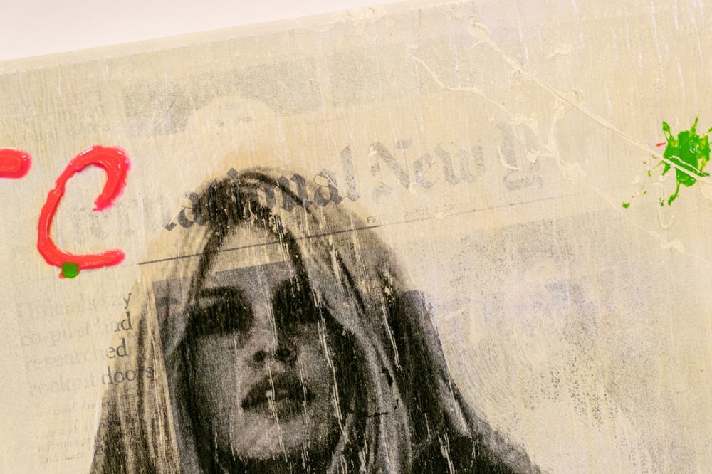 uvre de techniques mixtes de Ronald Chapeau, l'artiste complète des coupures de journaux et des impressions avec de la peinture acrylique sur toile.