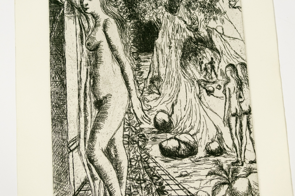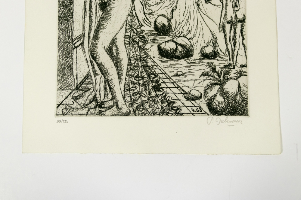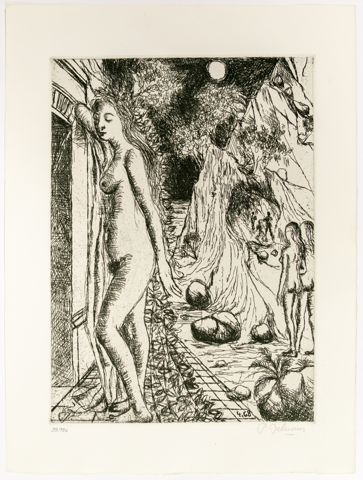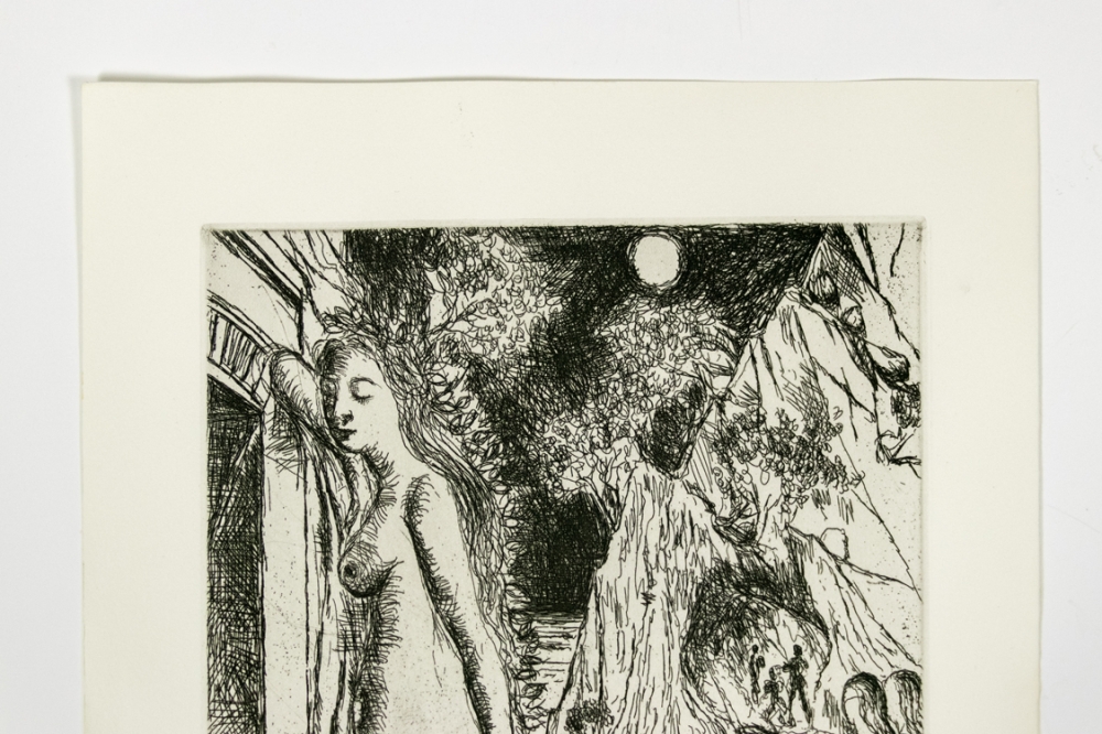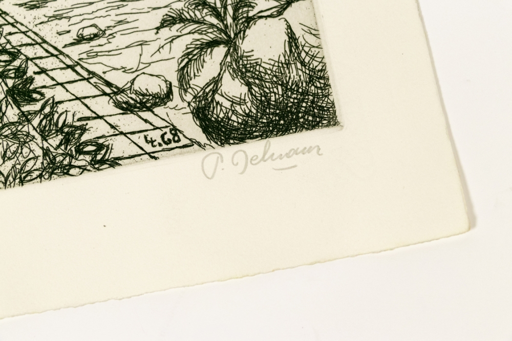 Gravure de Paul Delvaux de 1968, signée et numérotée à la main et limitée à 150. Elle appartient à la série "Sept dialogues avec paul delvaux", qui se compose de 5 eaux-fortes. est sans cadre et en excellent état.