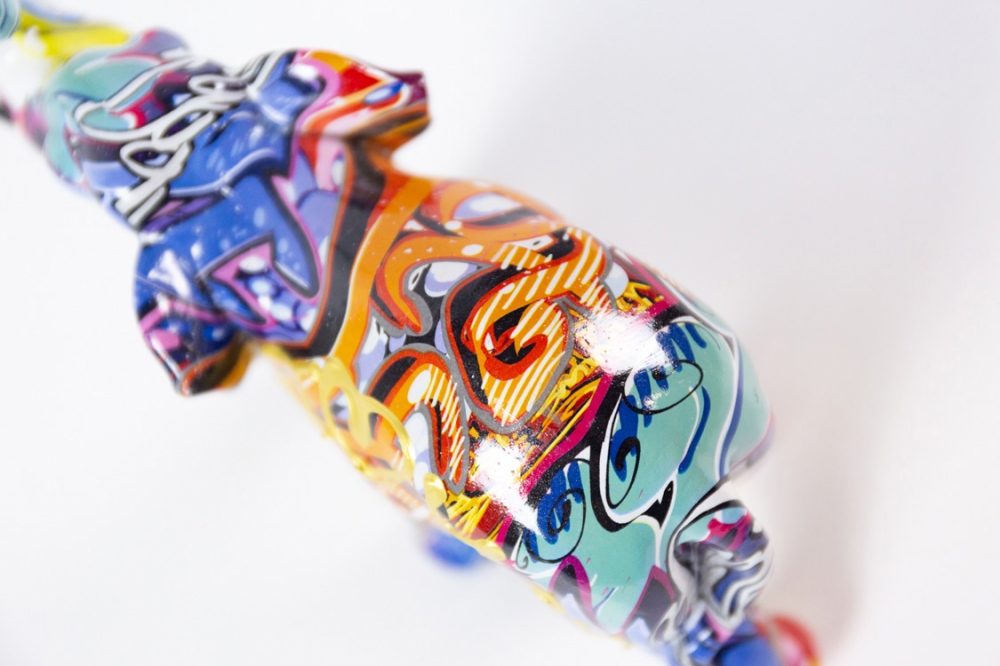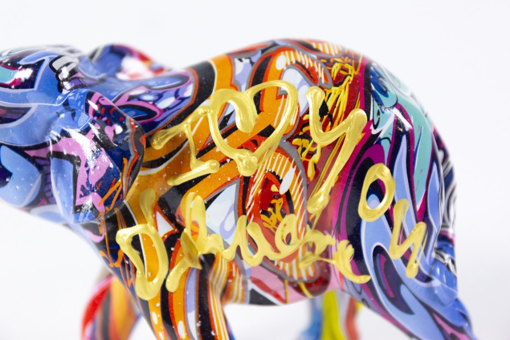 Sculpture en résine de Hannes D'Haese, complétée par un dicton à la peinture acrylique dans son style bien connu. Le dicton se lit comme suit : "Je [coeur] vous" et est également signé avec de la peinture acrylique.
