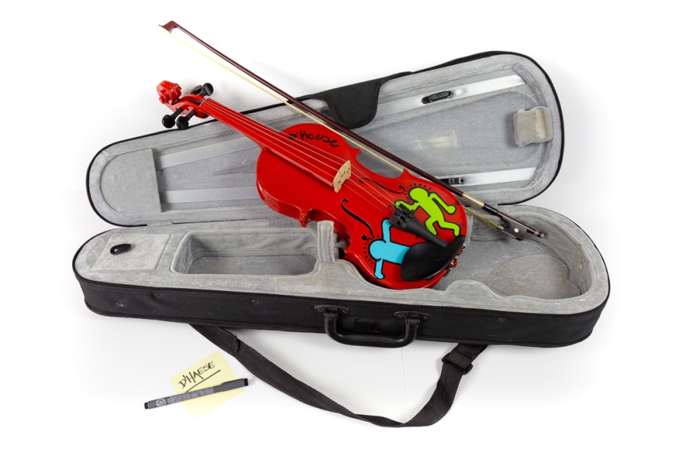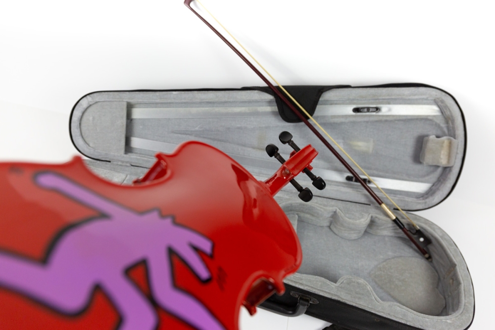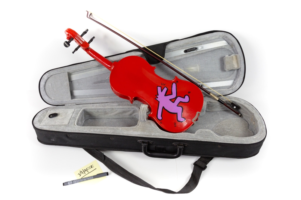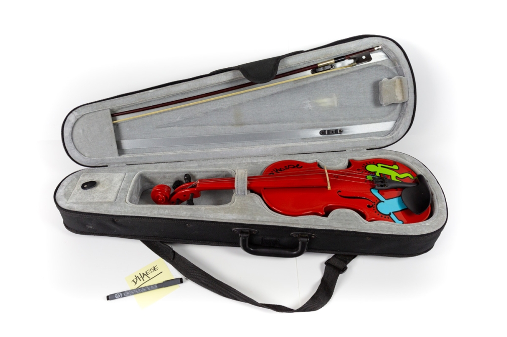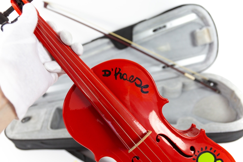 Hannes D'Haese has made a separate piece with this violin completely within his known style. The work itself is arranged on the violin. This is still packed in the original bag together with the presumably original bow.