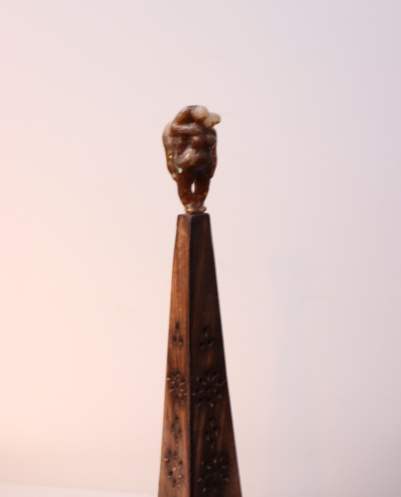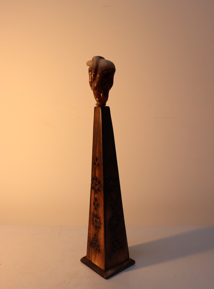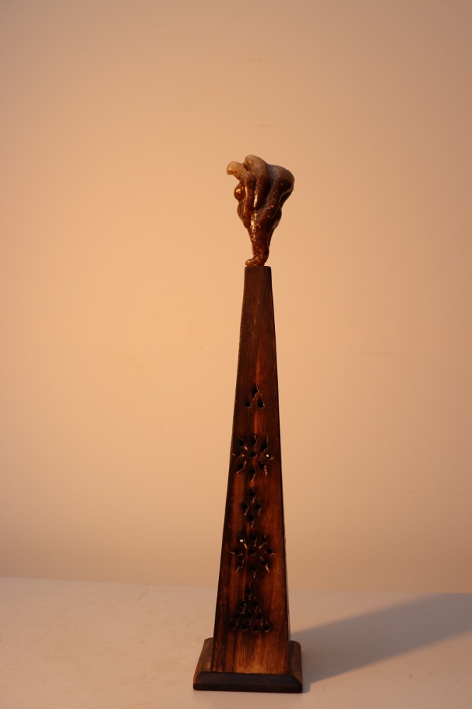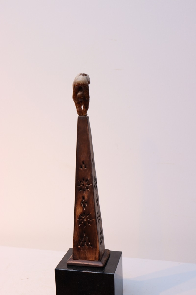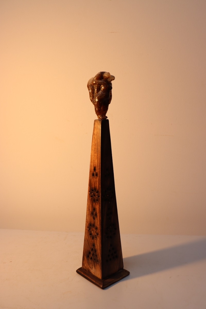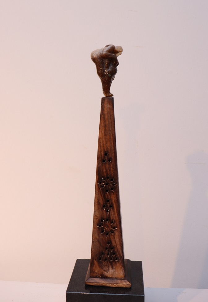 Gedragen Worden Mixed media van hout en glas Unicum Heel bijzonder ook nog mogelijk te gebruiken als wierook brander Martiene Stevens, 1951-Maastricht. Professioneel kunstenaar. O.a. twee exposities Natuurhistorisch Museum Maastricht. Chateau Oostwegel. Maastricht, Kerkrade. Exposities in gerenommeerde galeries in Nederland. Auteur van een 8-tal boeken . Eigenaar van Kunsthuis-Trobar in Riemst B. Vooral in de natuur vind ik mijn inspiratie. De laatste jaren maak ik naast sculpturen van brons en steen, vooral houtsculpturen van gevonden stukken hout uit bossen, velden, aan zee, etc.