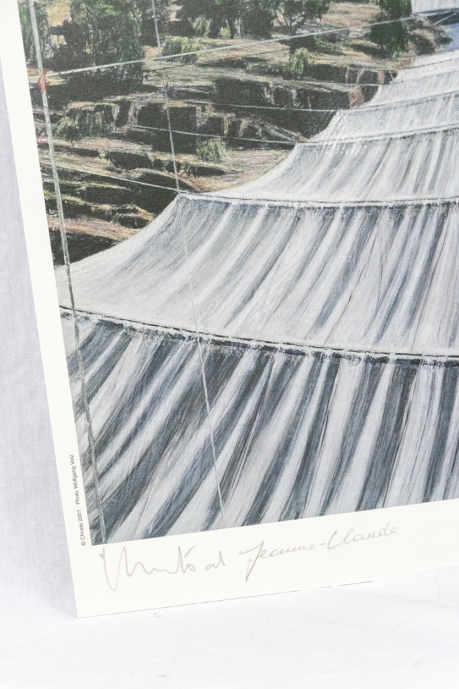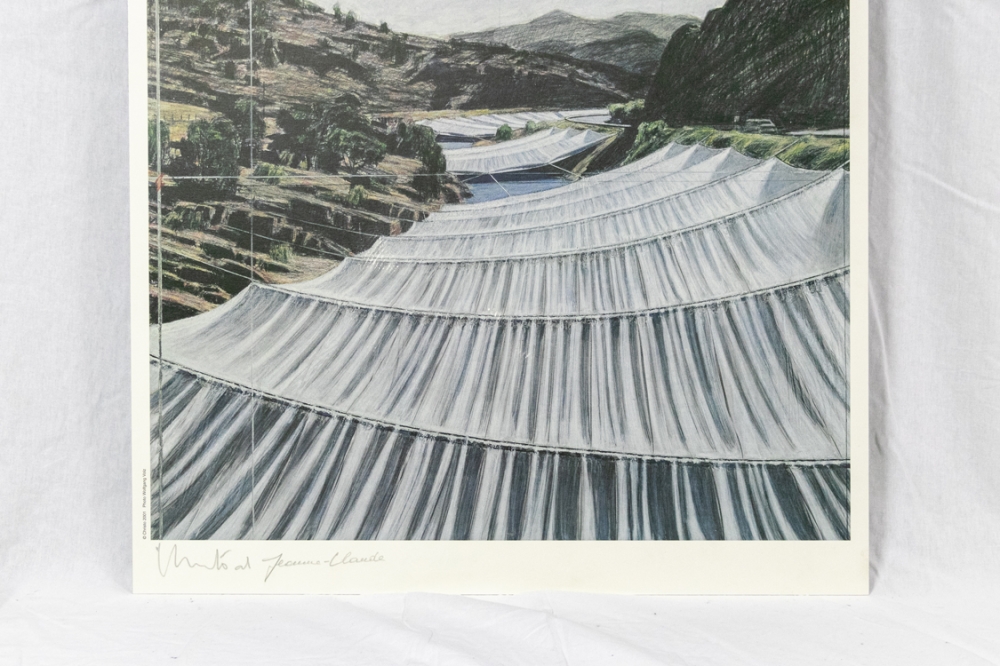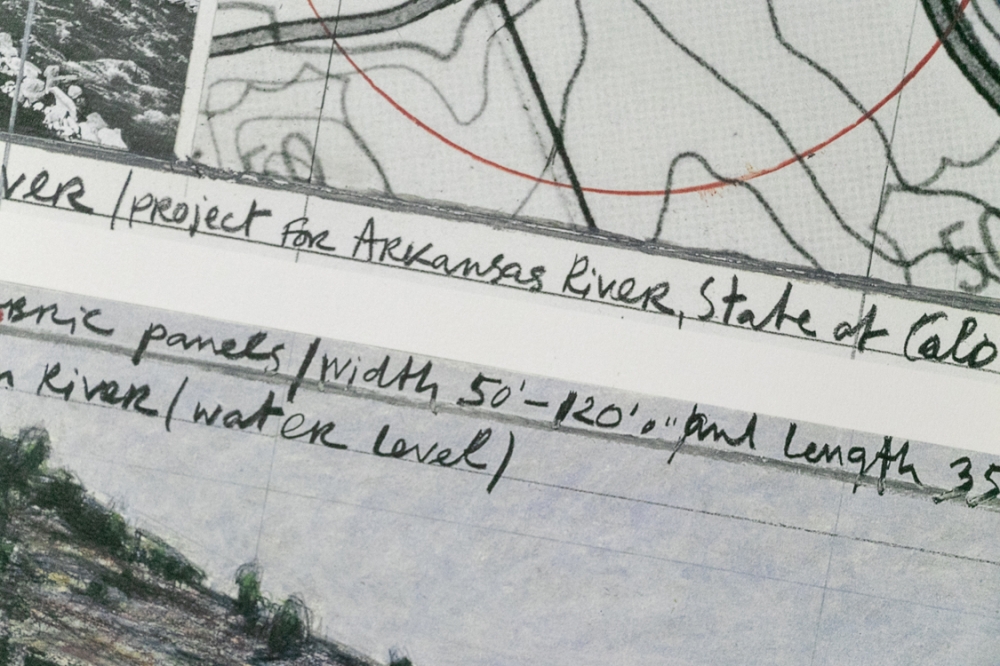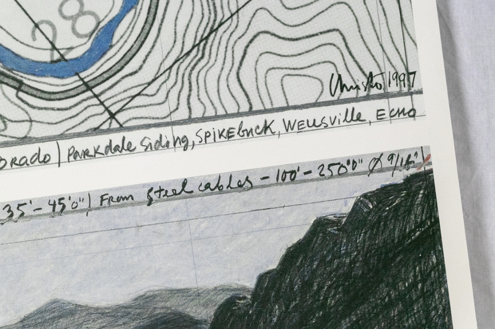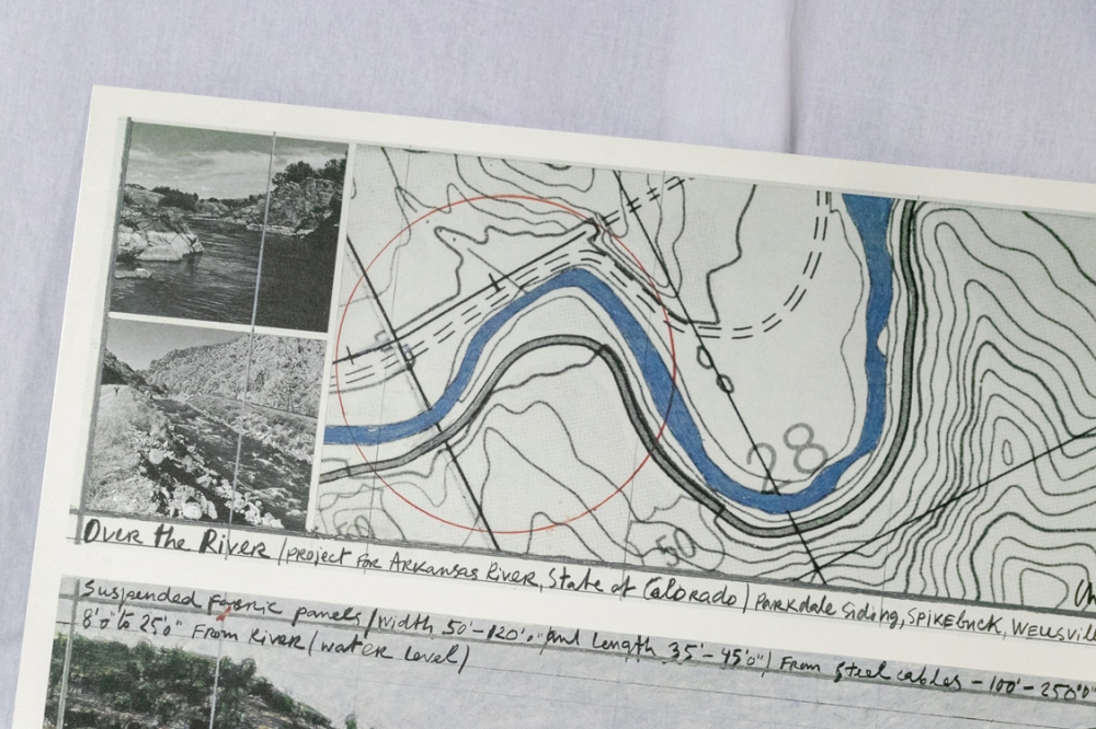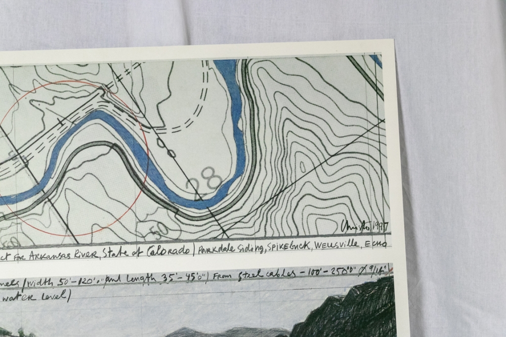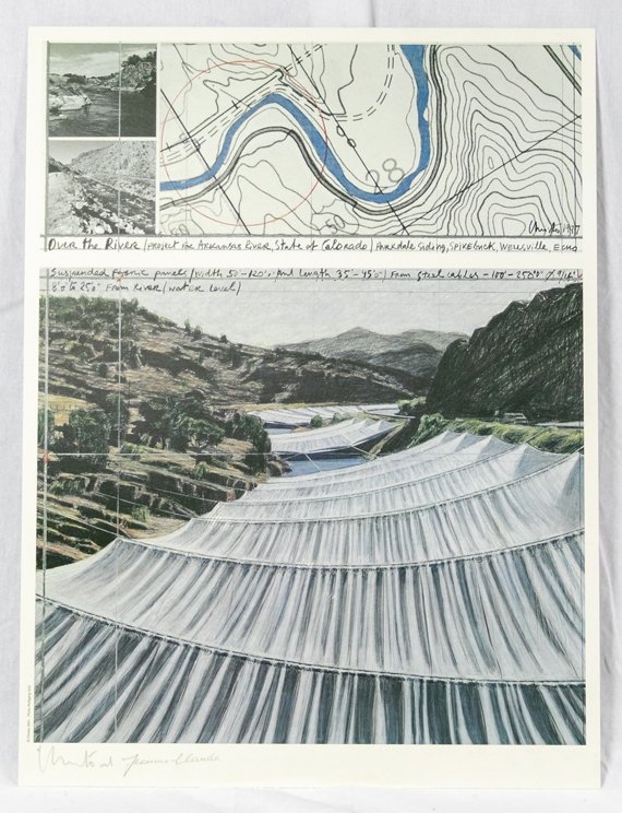 Offsetprint van "Over the river", een door Christo and Jeanne-Claude gepland project sinds halfweg de jaren '80. Na meer dan 30 jaar, 6 miljoen dollar in eigen investeringen heeft Christo in 2017 dit project geschrapt, moe van de juridische strijd met de lokale bewoners en uit protest voor de aanstelling van President Trump.