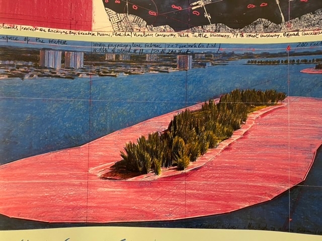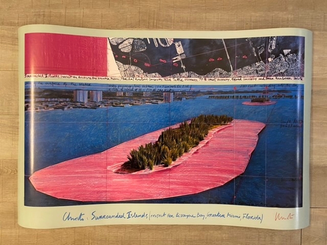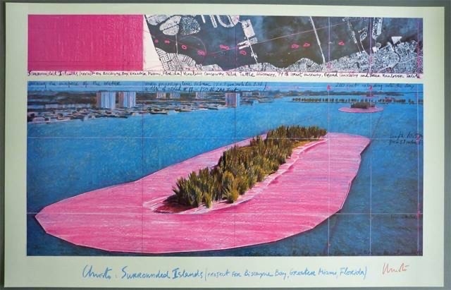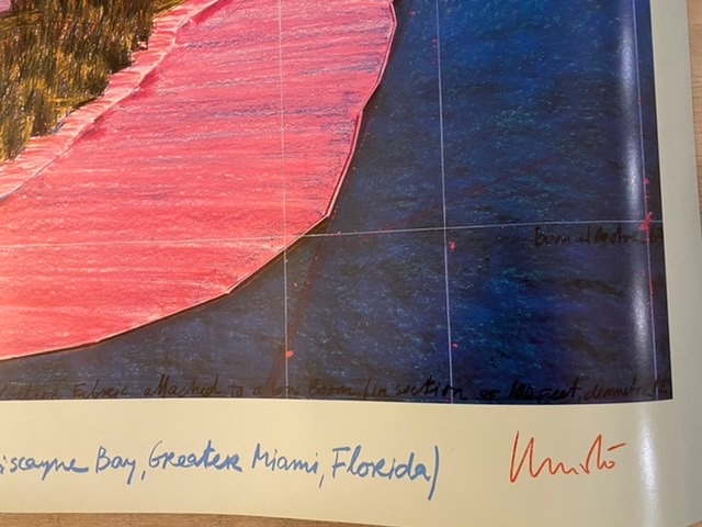 Kunstdruk uit 1982 gesigneerd door Christo in rode stift 63,5 x 99 cm Foto offset op stevig fotopapier Staat van instandhouding: zeer goed Zeer groot werk van Christo Surrounded Islands, Biscayne Bay, Greater Miami, Florida, 198083 was een milieukunstwerk uit 1983 waarin kunstenaars Christo en Jeanne-Claude een eilandengroep in Miami omringden met roze stof