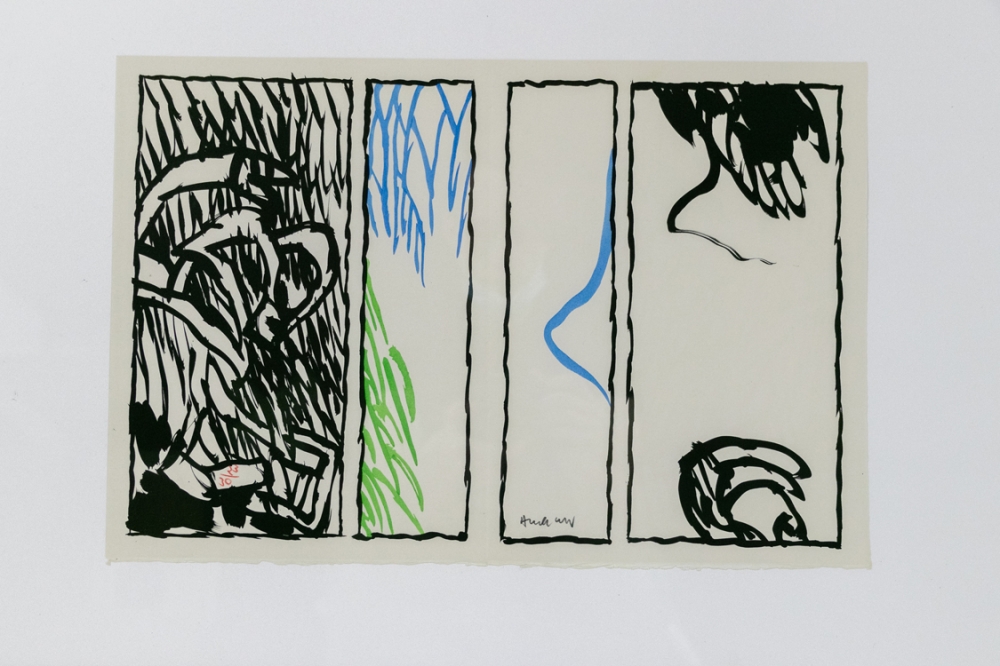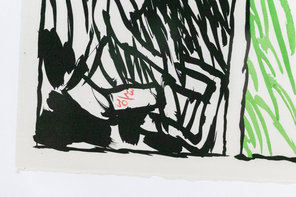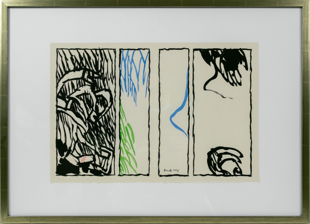 Lithografie van Pierre Alechinsky, aangevuld met watervef (blauw en groen). Gesigneerd en genummerd als 23/30.
