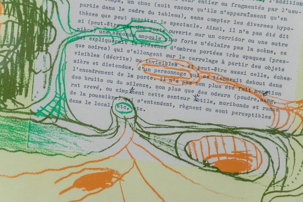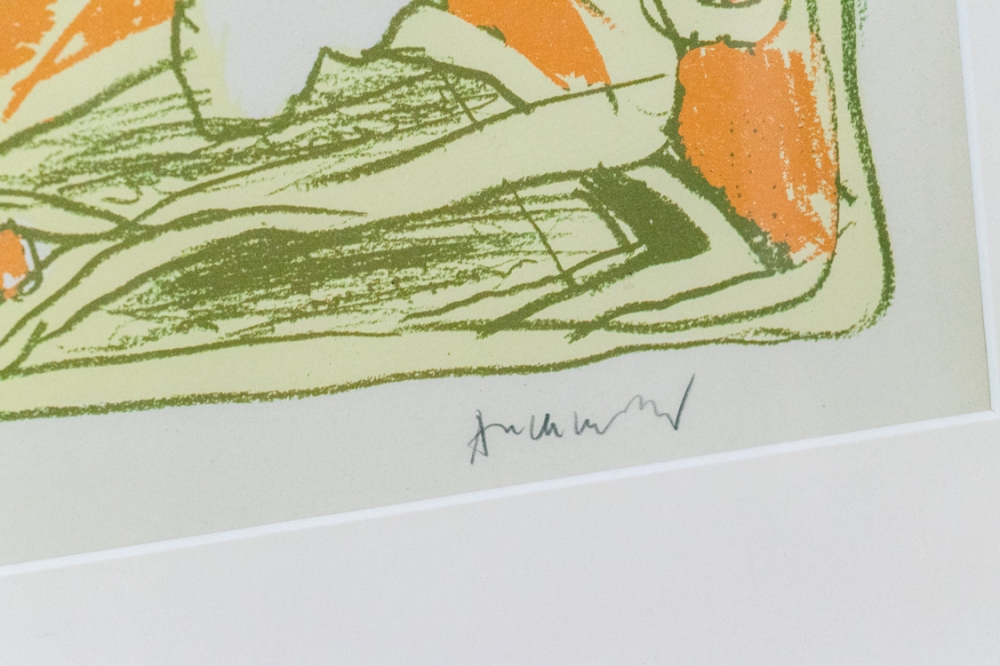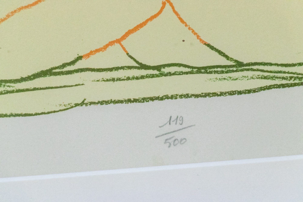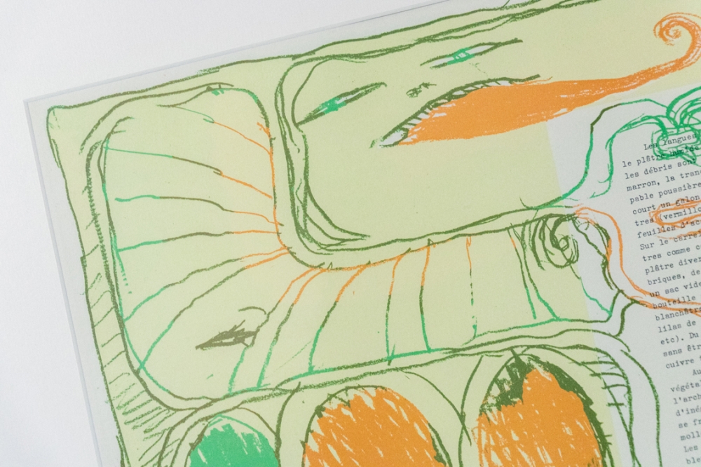 Lithografie van Pierre Alechinsky uit de Placards serie. De tekst is van Claud Siman, de handtekening van Mr Siman staat linksonderaan. Genummerd als 119/500, rechtsonderaan gesigneerd door Alechinsky.