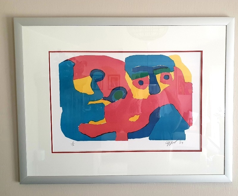 Karel APPEL (Amsterdam 1921 - Zürich 2006) Een prachtige litho ingelijst brede aluminium lijst met dubbel passepartout in perfecte staat met certificaat van echtheid Afmetingen beeldformaat 56 x 37