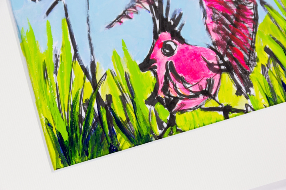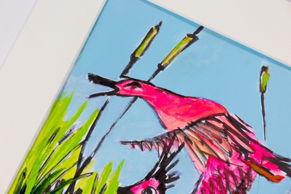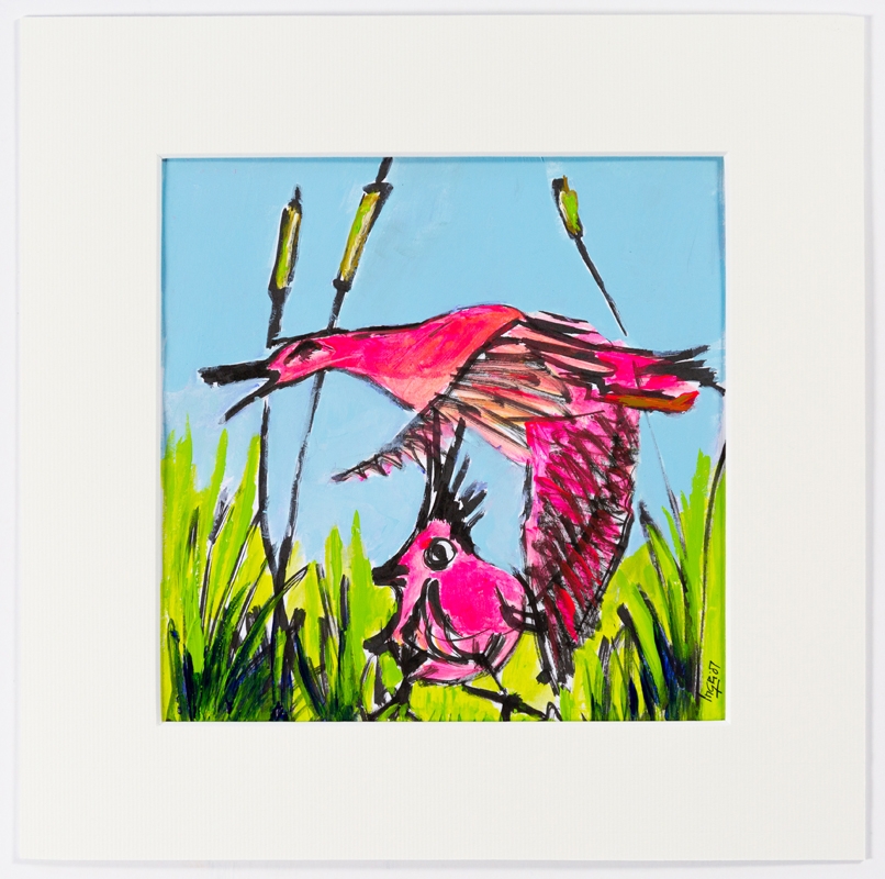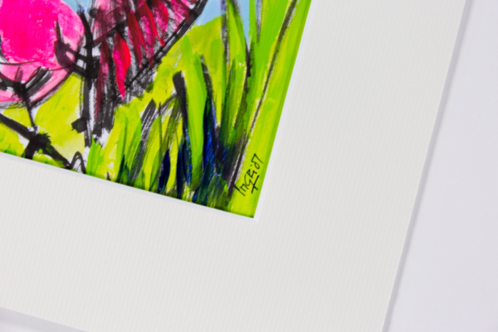 Colorful piece with a white passe-partout. Ingrid (Janssen) is a Belgian painter, graphic designer, educated at the Academies of Tournai, Ostend and Dunkirk. Figurative style infused with symbolism. Diversity in topics and techniques. Life is moving! "From the delicate and meticulous nature of the fine feather to the raw brush strokes that emerge, Ingrid makes the most out of every tool, every technique according to mood, the moment, always at the service of expression. Curious by nature, interested in everything , her subjects vary in great wealth. She is exploring, don't stay on track »