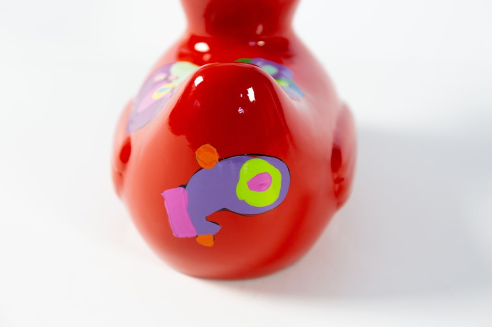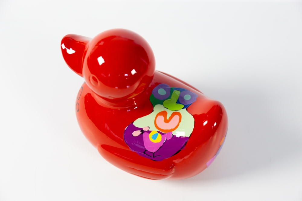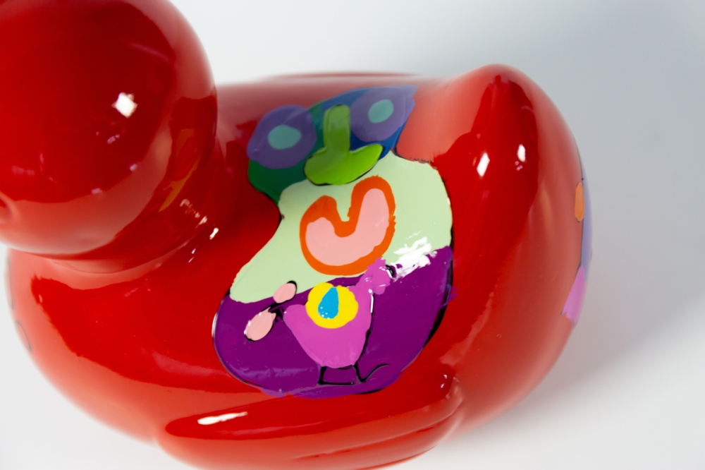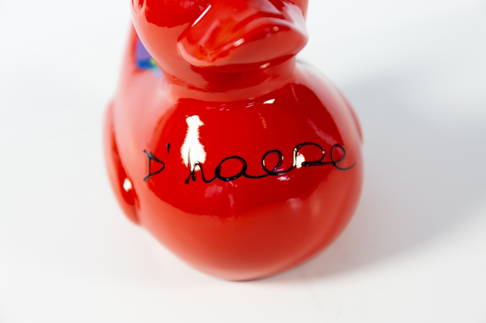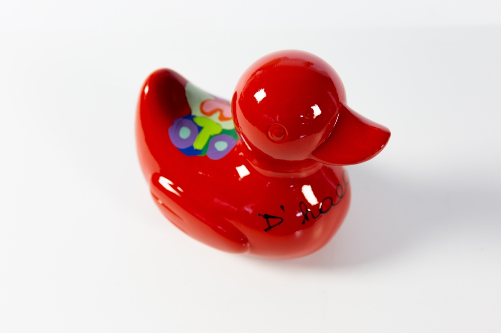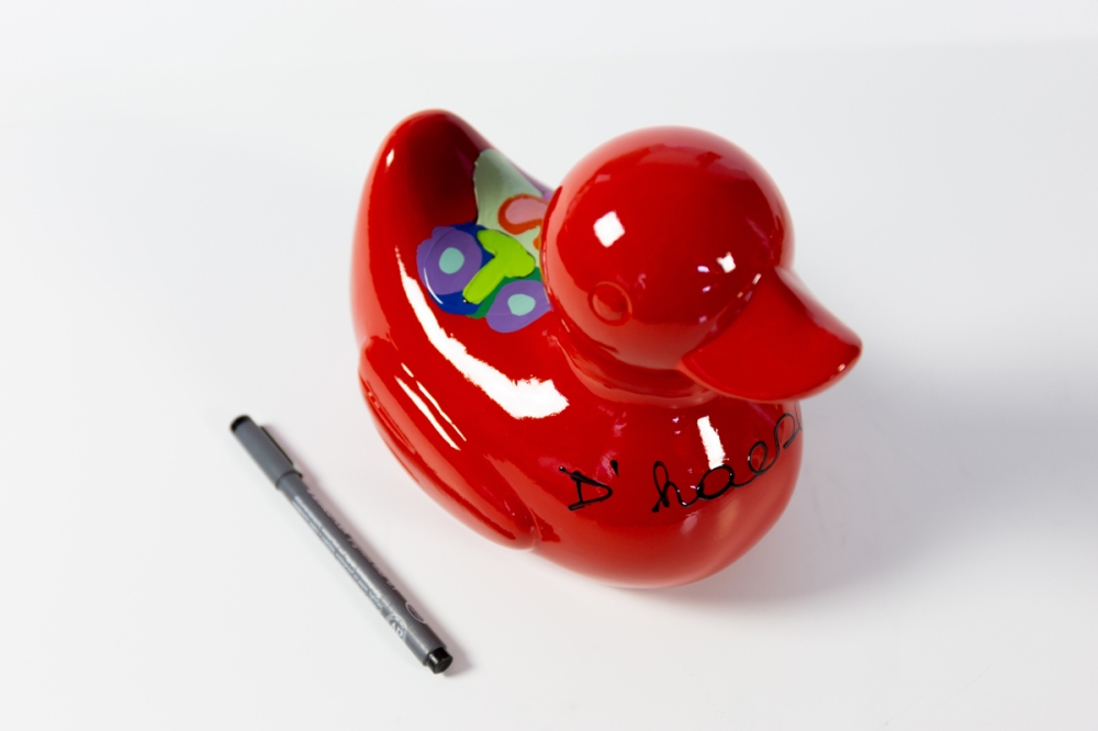 A red duck from the Hannes D'Haese collection! The work is made in synthetic resin and painted artfully and characteristic by Hannes.