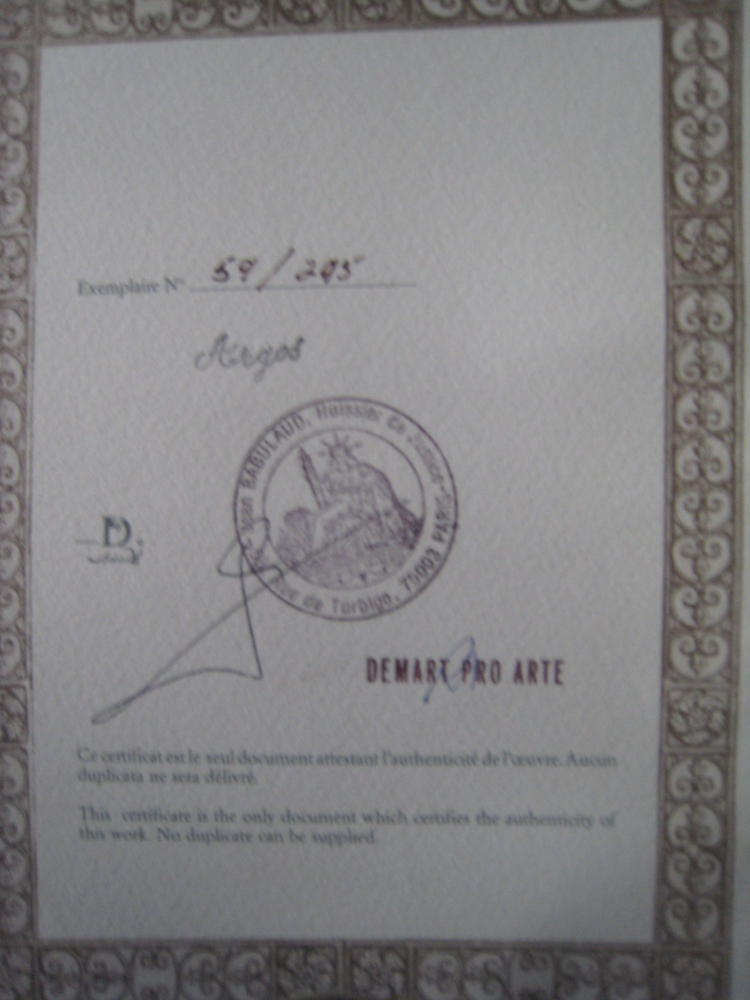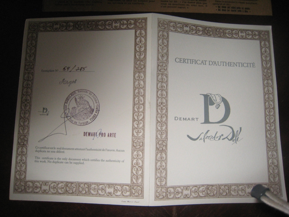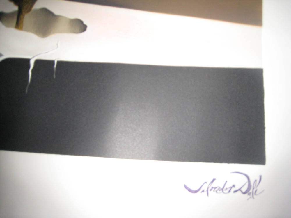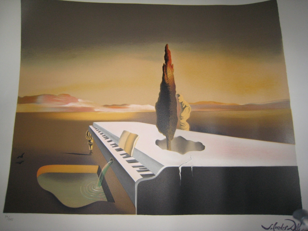 Kleur-litho van Salvador Dali in originele staat (niet ingekaderd).Oorspronkelijke titel : Fonteine coulant d'un piano à queue. Gesigneerd met vertificaat van echtheid. Afmetingen : 80cm x 58cm. Beeldformaat : 59cm x 47cm. Afdruk 59 van 295.