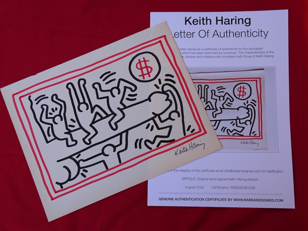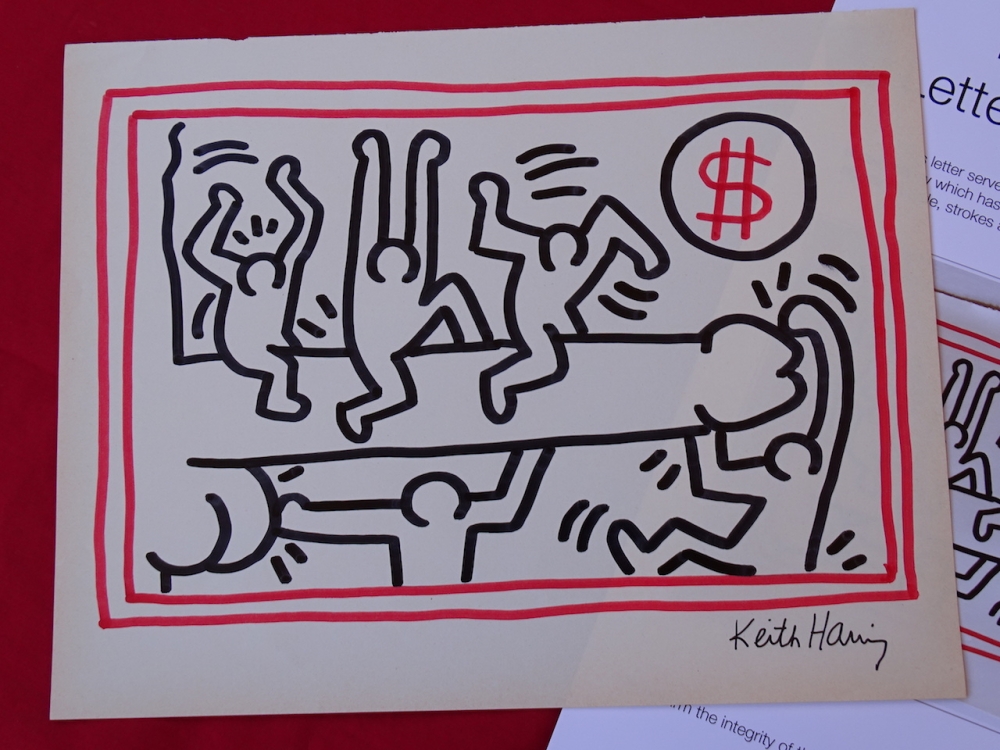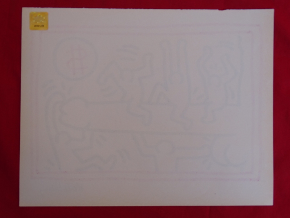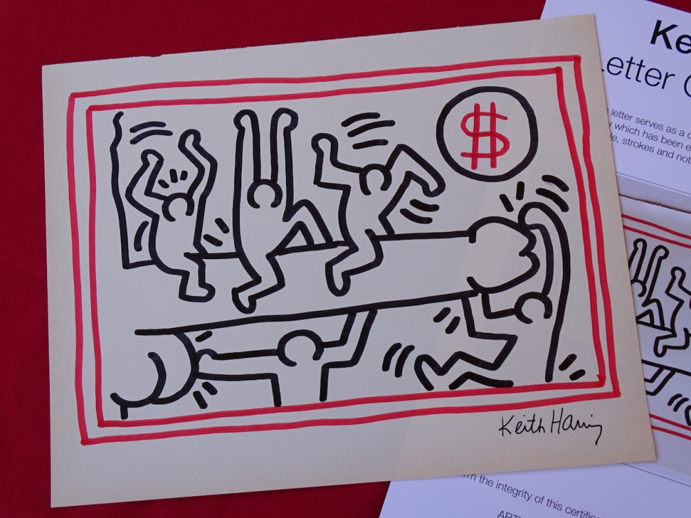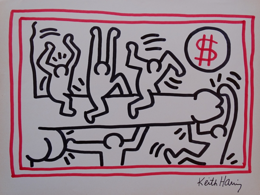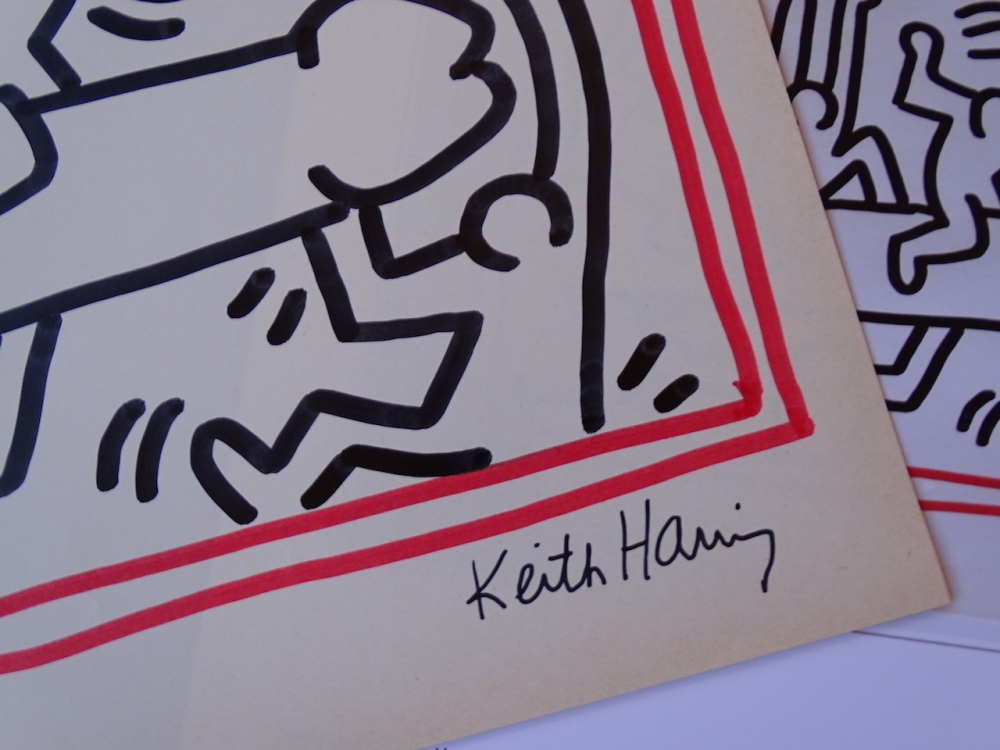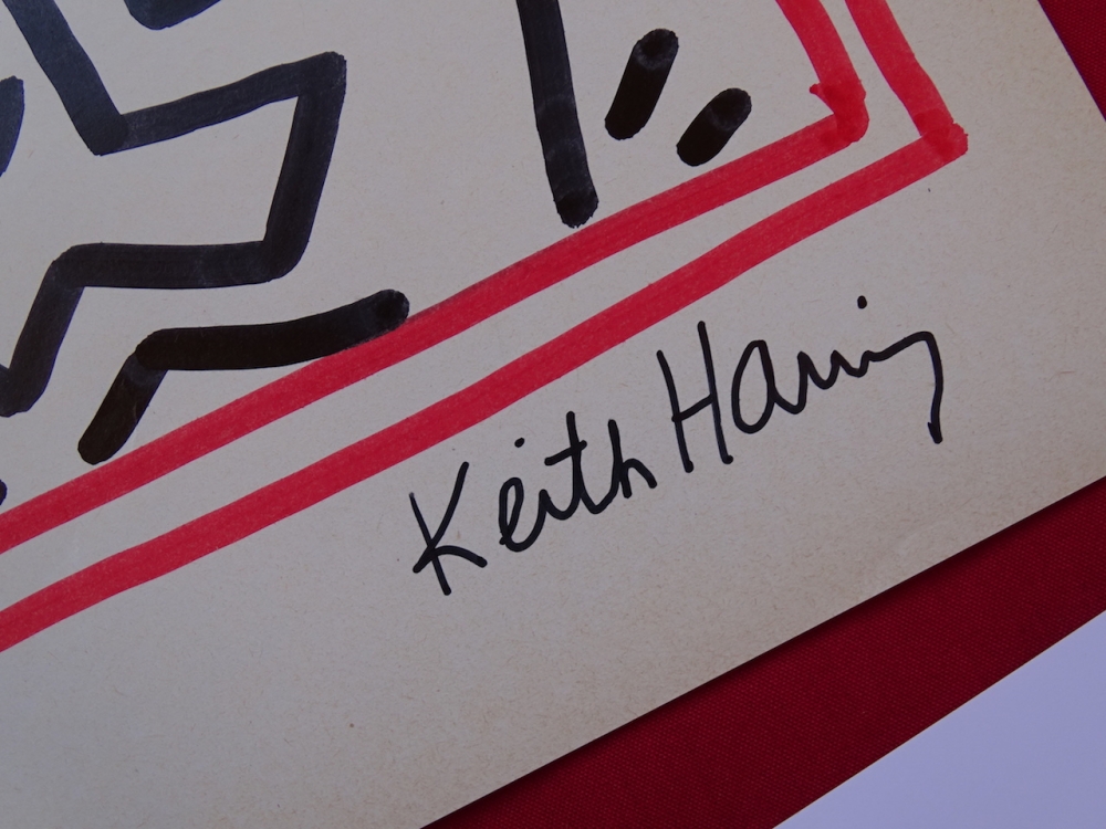 Keith Haring (attributed), ink drawing Keith Allen Haring (May 4, 1958 February 16, 1990) was an American artist whose pop art emerged from the New York City graffiti subculture of the 1980s. His animated imagery has "become a widely recognized visual language". Much of his work includes sexual allusions that turned into social activism by using the images to advocate for safe sex and AIDS awareness. In addition to solo gallery exhibitions, he participated in renowned national and international group shows such as documenta in Kassel, the Whitney Biennial in New York, the São Paulo Biennial, and the Venice Biennale. The Whitney Museum held a retrospective of his art in 1997.