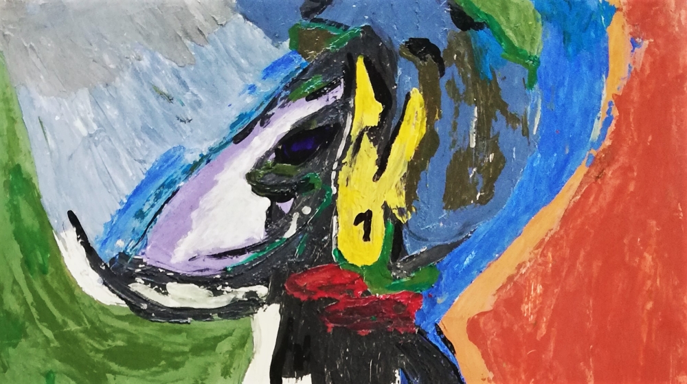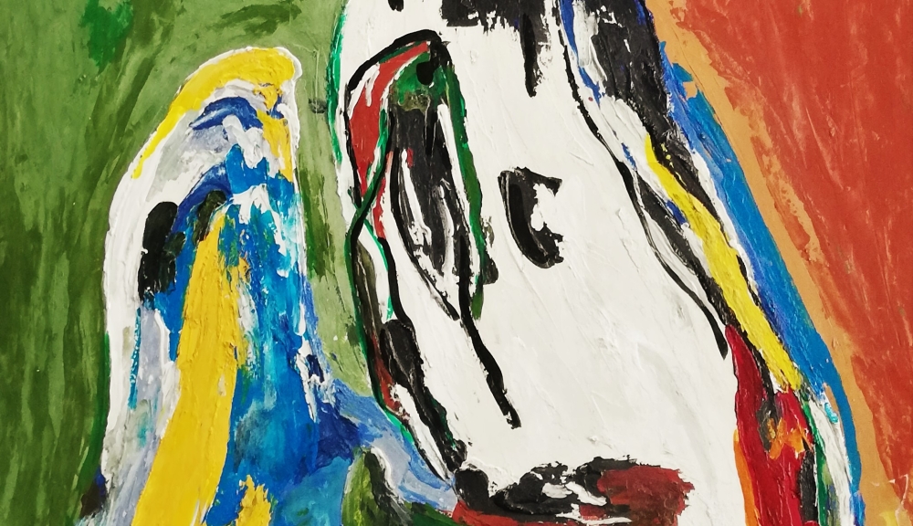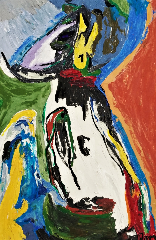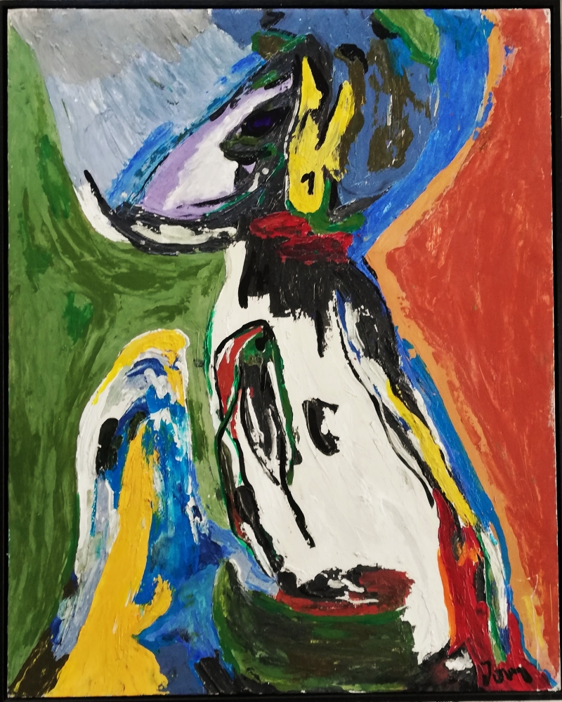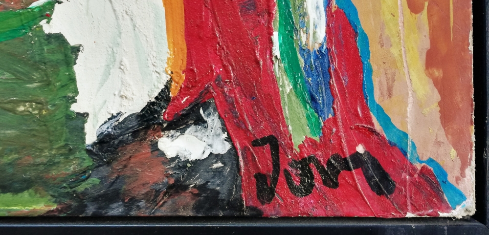 Asger JORN (1914-1973) After Groot abstract COBRA schilderij van abstracte koppen. Olieverf op karton. Afmetingen zijn 100 x 80 cm. Rechts onder is het schilderij gesigneerd. In een zwart kader, er zijn hier en daar kleine krassen aan het werk.