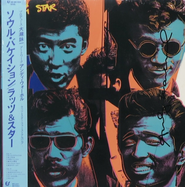Pochette LP signée à la main de la version japonaise de l'album Soul Vacation du groupe Rats & Star. LP est très joliment encadré avec passe-partout assorti. Les dimensions du cadre sont : 52 x 72 cm. Le couvercle est également partiellement scellé et muni d'une bande OBI. Le nom du groupe pop japonais des années 1980 découle de la conviction qu'il est possible d'être un «rat», issu d'un milieu moins aisé, et de devenir une star: une compréhension proche du cur de Warhol en tant que fils de travailleurs migrants.