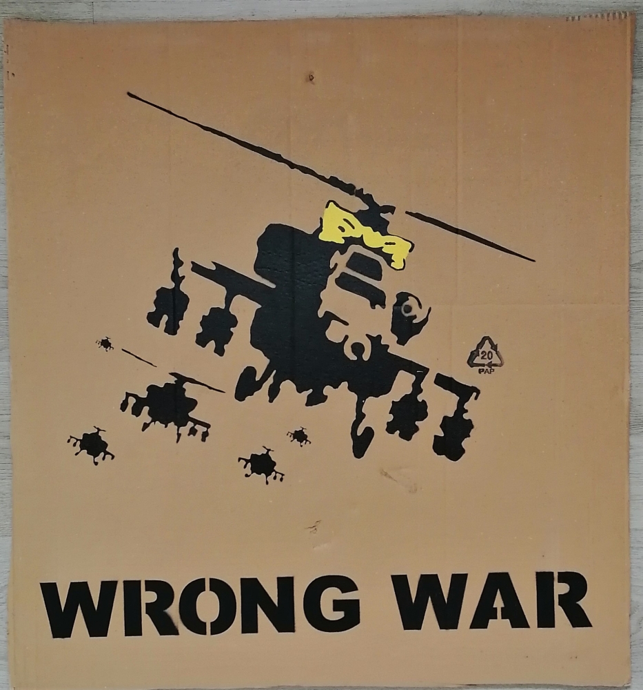 Origineel GROOT attributed protest bord uit 2003 Het is gebruikt om te protesteren in Londen tegen de oorlog in Irak, zoals op de foto's te zien. Spray verf op karton. Deze werken zijn zowaar nooit gesigneerd en deze wordt als attributed aangeboden omdat het niet als "kunst" bedoeld is. De afmetingen bedragen 68 x 73 cm