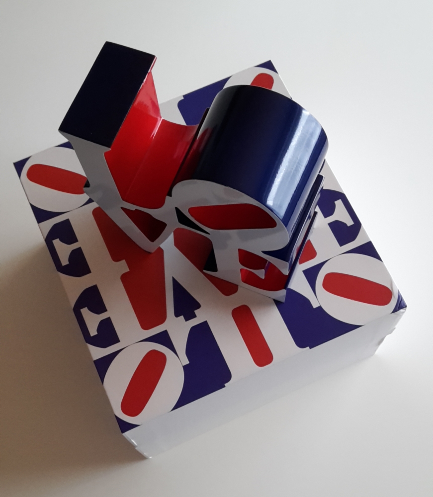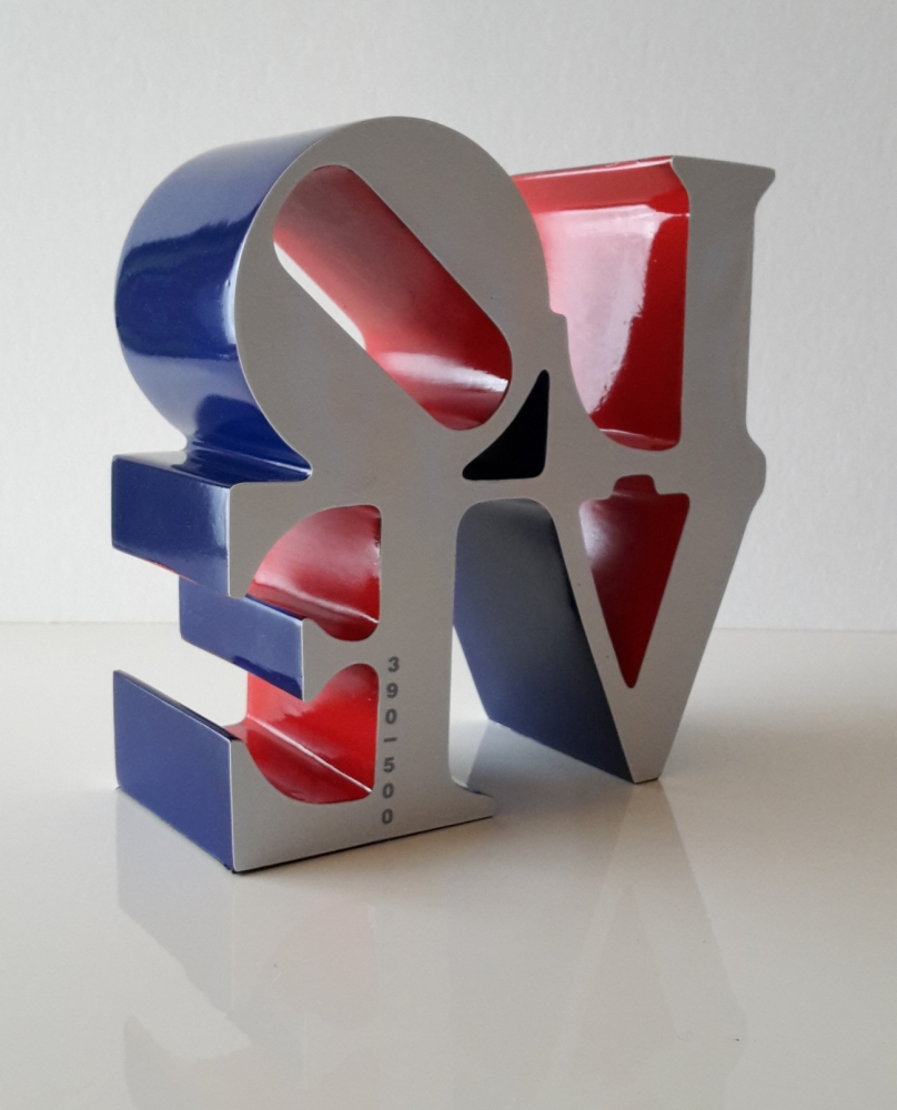 Love (Bleu Blanc et Rouge). Sculpture en résine éditée par le studio Editions de la sculpture "Love" de Robert Indiana. Limité à 500 ex. dont voici le n° 390. 15x15x7cm (HxLxP). Livré avec certificat dans la boîte d'origine.