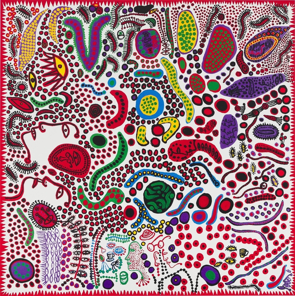 Yayoi Kusama is a famous Japanese artist. Among his most famous works are his Polka Dot Pumpkins. Offset lithograph in colours on paper Artist: Yayoi Kusama Title: Endless Life of people Dimensions: 40 x 40 cm
