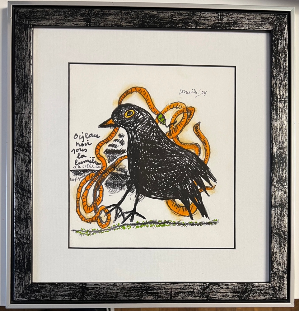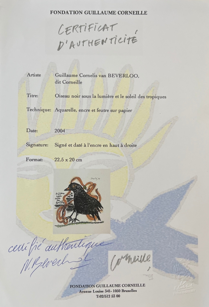 Oeuvre originale encadrée datée de 2004 du peintre Guillaume Corneille (1922-2010), né à Liège de parents Néerlandais, membre fondateur du groupe Cobra avec Karel Appel, Asger Jorn, Constant, Dotremont, Jacques Doucet ou encore Alechinsky. Dimensions : 24 x 22 cm. Dimensions du cadre : 37 x 35 cm. Tampon Atelier Corneille au dos. Délivrée avec un certificat d'authenticité de la Fondation Guillaume Corneille. Oeuvre référencée et reproduite en noir & blanc dans un état intermédiaire à l'encre noire, avant sa coloration, dans le catalogue Cuba, par Corneille et Nico Koster, Studio Koster éditions, 2004. Une belle oeuvre en souvenir des Caraïbes, une région qu'appréciait beaucoup le peintre voyageur, et une référence à ses débuts : au serpent Cobra. Aquarelle, feutre et encre de chine sur papier Signée et datée de la main de l'artiste en haut à droite, titrée à gauche. Très bon état. Envoi sécurisé par UPS Exposition des 75 ans de Cobra à partir du 1er Juin au Cobra Museum à Amstelveen. Exposition Cobra avec la plus grande collection américaine de Corneille à Miami au printemps et en été 2023. Rétrospective Corneille qui vient de se terminer ce 15 Janvier au Cobra Museum à Amstelveen. Sortie d'un timbre Cobra / Corneille chez Bpost en 2023 Bijoux Corneille exposés à la Fondation Boghossian jusqu'au 14 Mai 2023 (Ornamentum, Collection Diane Venet)