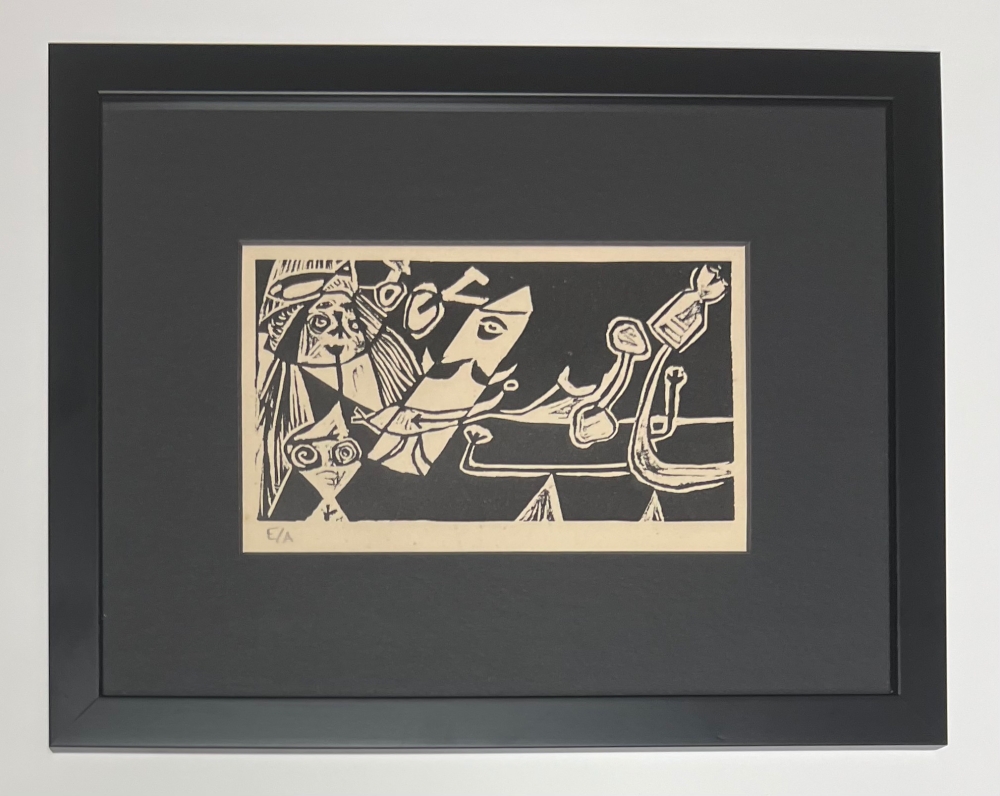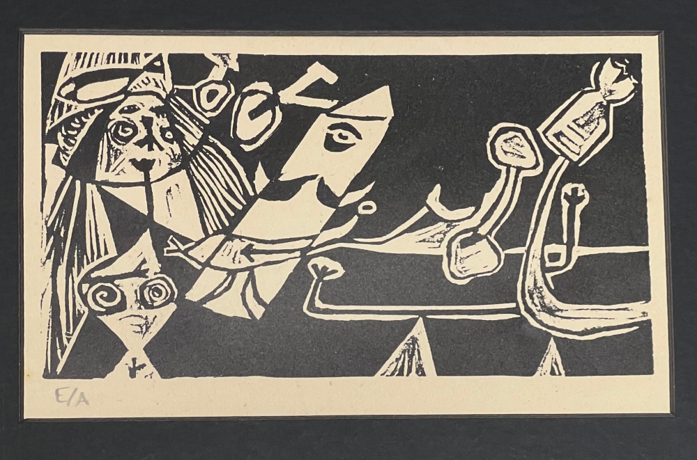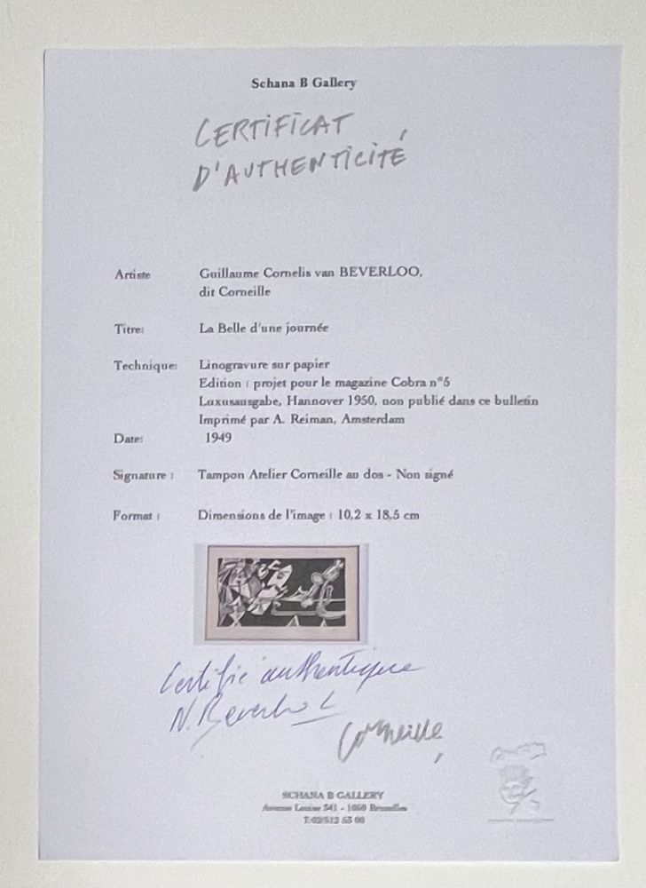 Linogravure "La Belle d'une journée" de 1949, encadrée, prête à être accrochée, avec tampon Atelier Corneille. Dimensions totales : 27 x 34 cm. Très bon état Oeuvre délivrée avec un certificat d'authenticité. Projet pour la revue Cobra n°5 - Tirage non numéroté - Quelques exemplaires seulement - Luxusausgabe, Hannover 1950. Impression A. Reiman, Amsterdam. Très bon état avec une légère tache de jaunissement sur le papier en hait de l'image. Linogravure référencée sous le numéro 8 du catalogue raisonné des oeuvres graphiques de Corneille par Donkersloot. Dimensions de l'image : 10,2 x 18,2 cm. Dans cette belle linogravure issue de la Collection Guillaume Corneille, le peintre met en place quelques éléments qui constituèrent le langage de sa peinture Cobra : la spirale, le poisson volant, l'oeil surréaliste, les personnages poissons, la géologie d'un paysage montagneux. Les lignes rappellent les dessins d'enfants. La fusion du minéral et du vivant laisse libre court à plusieurs interprétations de l'image. Ce langage naquit chez le peintre après son observation des oeuvres de Miro et de Picasso et fit suite à son séjour en Tunisie (1949) où il reproduisit l'itinéraire artistique de Paul Klee. Il y a quelque chose de primitif dans les motifs et un amour des cultures lointaines comme dans la peinture de Matisse. Envoi sécurisé par UPS Guillaume Corneille (1922-2010) né à Liège de parents Néerlandais fut l'un des membres du groupe Cobra avec Constant, Dotremont, Karel Appel, Asger Jorn, Noiret, Doucet, ou encore Alechinsky.