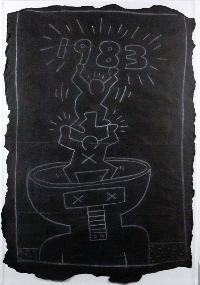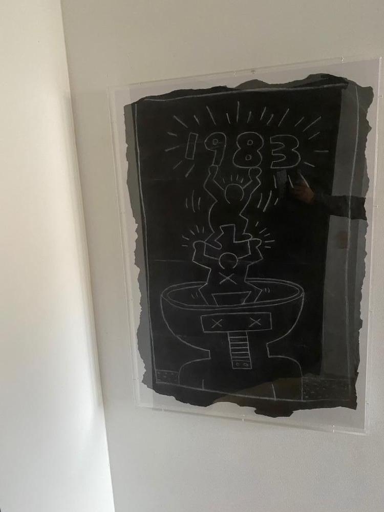 1983 NY SUBWAY DRAWING originele kalktekening op zwart mat papier. Zichtbare kreuken en deuken aan de voorzijde, op de achterzijde restanten van een billboard. Eind 1980 merkte Haring op dat de lege advertentieruimtes van de New York City-metro bedekt waren met mat zwart papier toen de advertentie-abonnementen afliepen. Hij kocht meteen wat krijt en begon te tekenen. In de daaropvolgende vijf jaar werd dit een dagelijkse, repetitieve obsessie. Haring tekende in een periode van vijf jaar, van 1980 tot 1985, meer dan 5.000 krijttekeningen in metrostations in New York City. zijn metro tekeningen behoren tot zijn bekendste en meest gevierde werk. Van het grote aantal gemaakte tekeningen in de subway werden er enkele gepubliceerd in een boek art in transit en 31 subway drawings. Volgens de Keith Haring Foundation was deze street art, gemaakt door de kunstenaar, niet bedoeld om later verkocht te worden. Werk is ingelijst in een plexibox (uitstekende staat) 1983 NY SUBWAY originele kalktekening op zwart mat papier private collection Los Angeles USA, private collection Miami USA, private collection Belgium