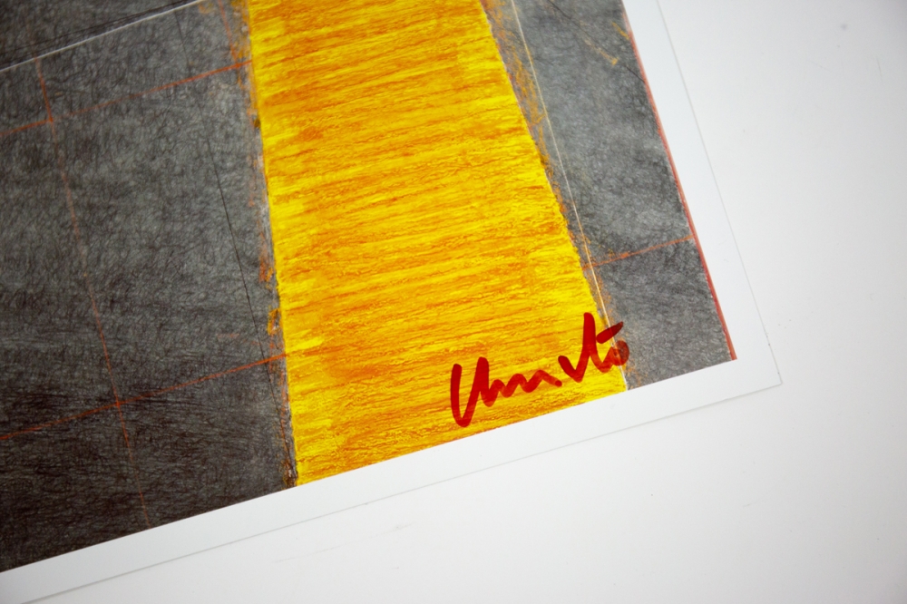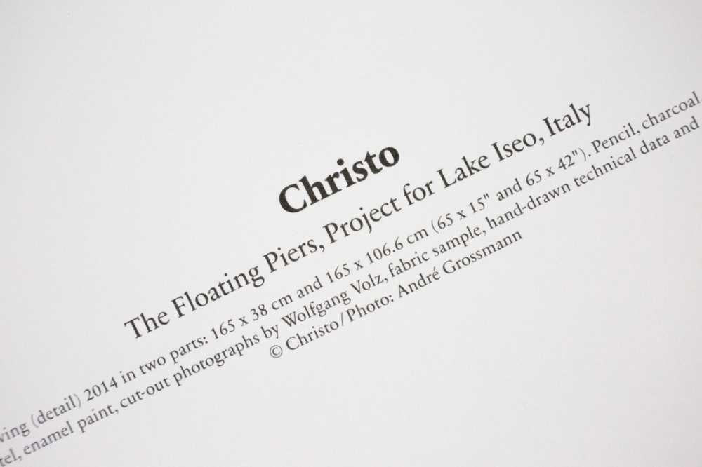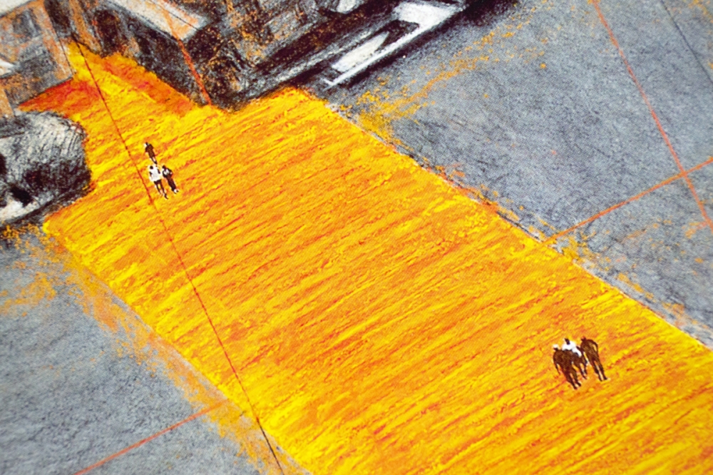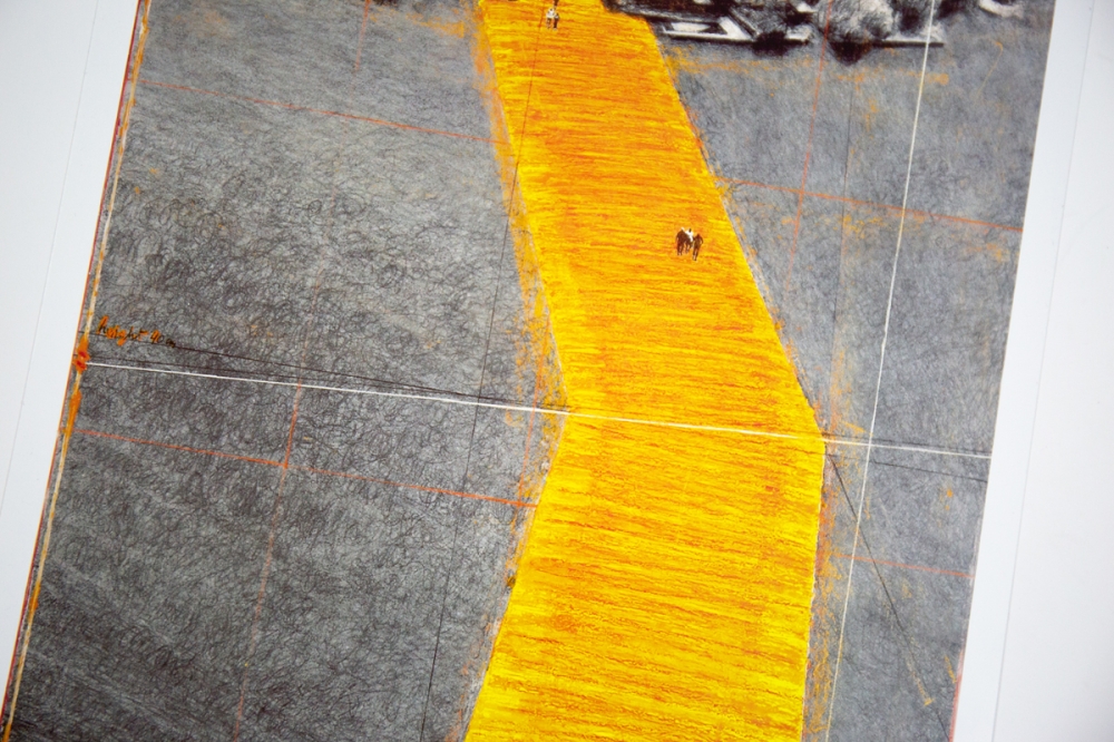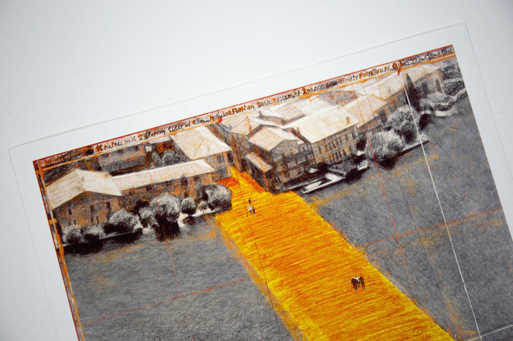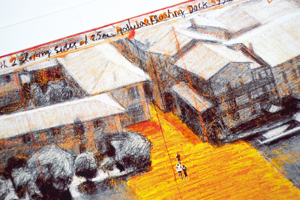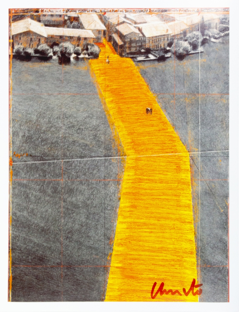 Offsetkleurendruk van "The Floating Piers" een ontwerp voor een tussen 2014 en 2016 gerealiseerd project in Italië, op het Iseo meer. De constructie is op zijn zachtst gezegd indrukwekkend te noemen en vervaagt klaarblijkelijk de grens tussen werkelijkheid en fantasie. Volledig door Christo zelf gefinancierd, bleef deze 16-daagse exhibitie gratis toegankelijk voor het grote publiek vooraleer het terug werd afgebroken.