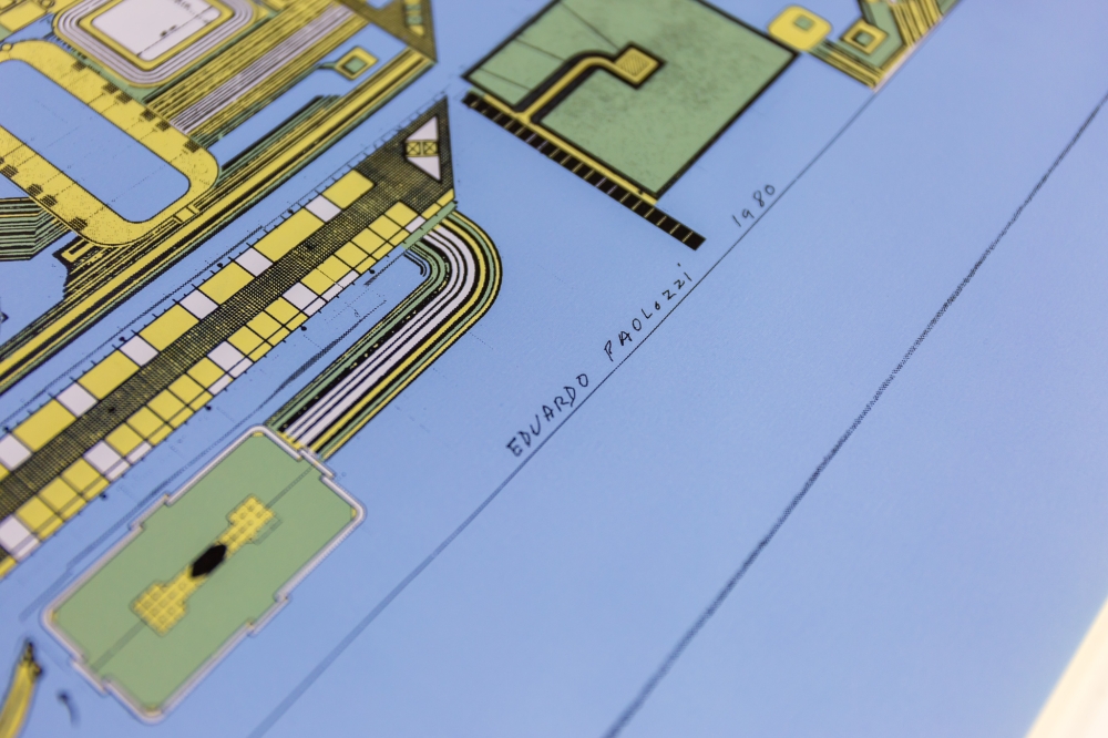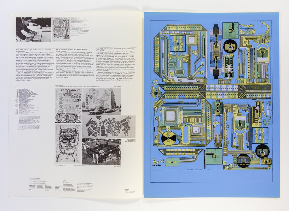 Kleurrijke en aparte zeefdruk op blauw gekleurd "CHROMOLUX color" die tot stand kwam voor Art Zanders '80 door de samenwerking tussen Eduardo Paolozzi en Grafikwerkstatt Hamburg, Hans Kahler. Dit werk samen met de originele kaft uit 1980.