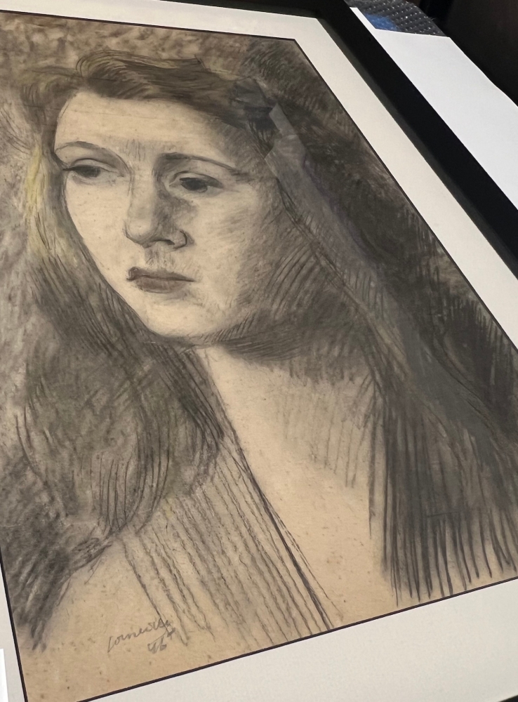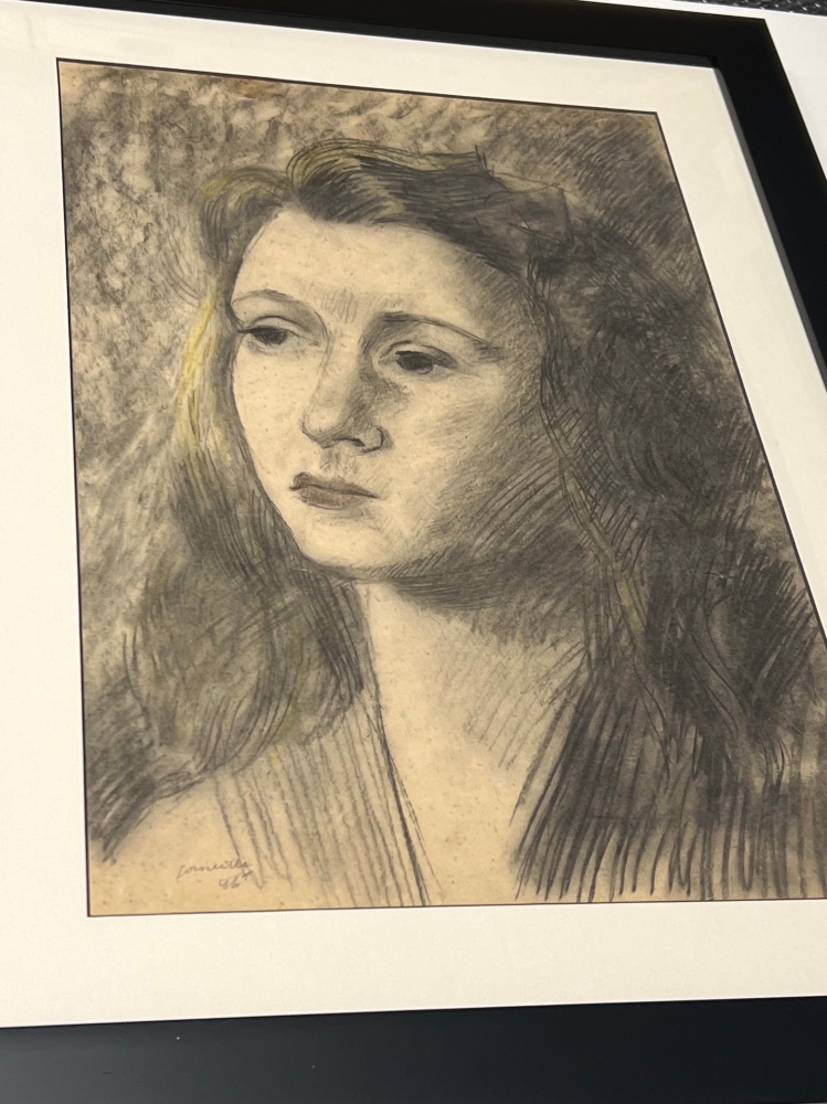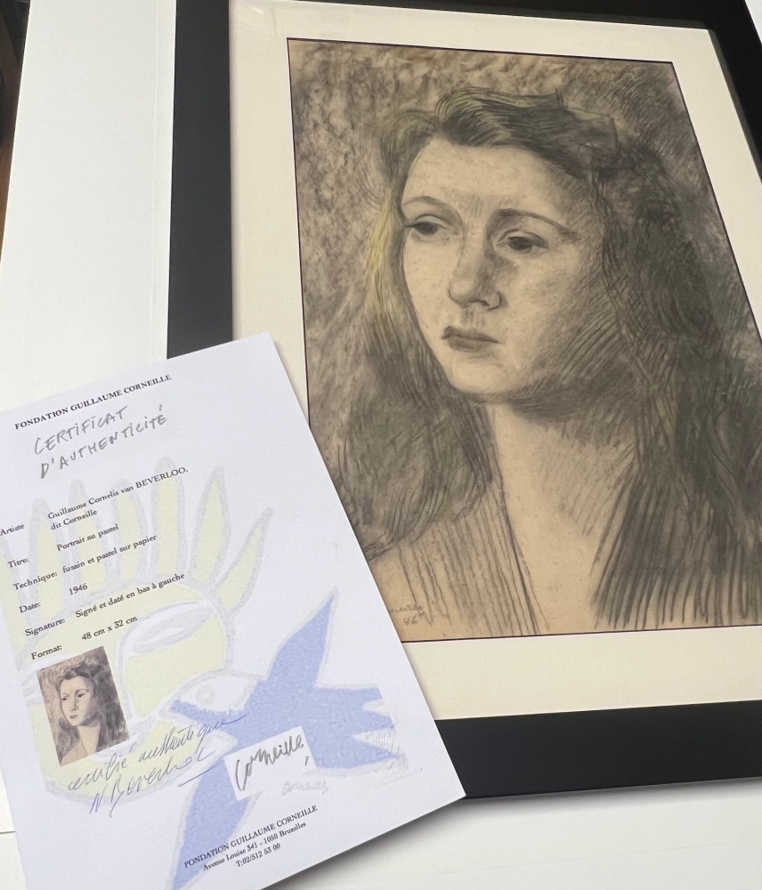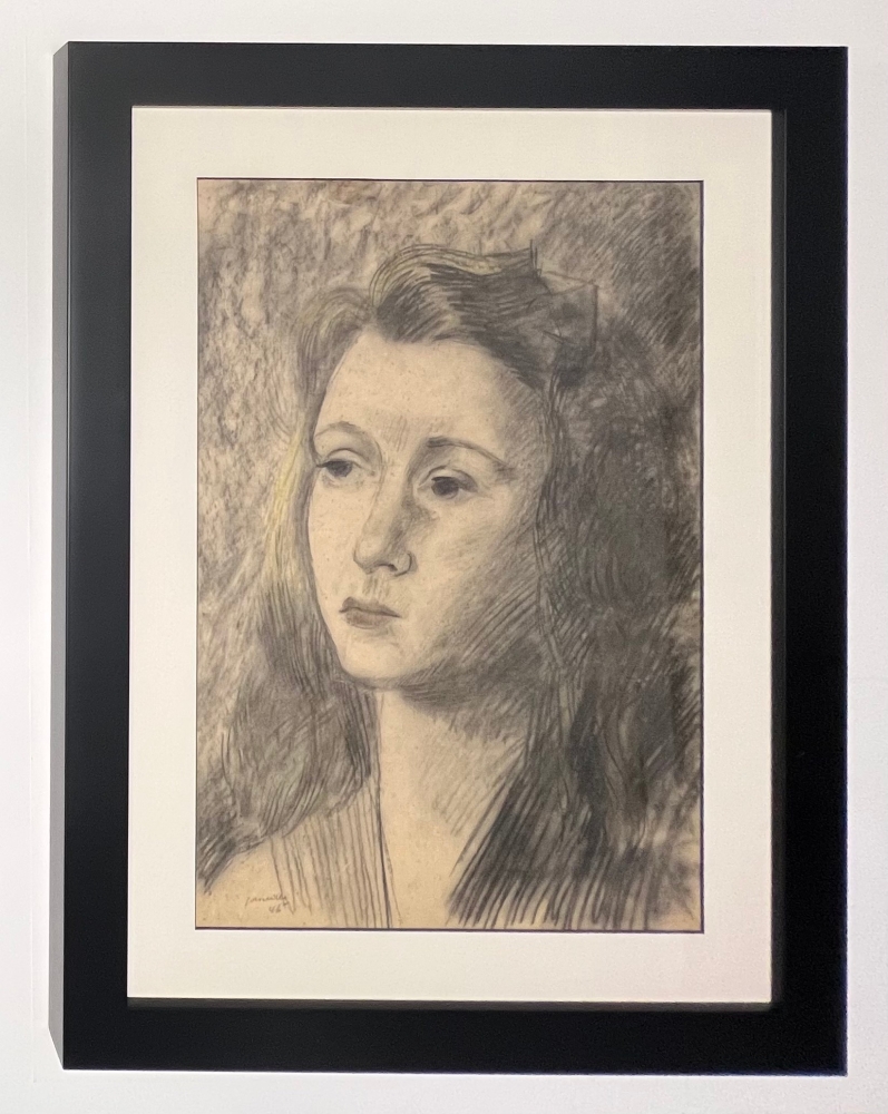 Beau portrait au fusain et pastel de 1946, réalisé par le peintre à l'âge de 24 ans (Il s'agit certainement de Wanda). Délivré avec un certificat d'authenticité de la Fondation. Cadre épais de 5 cm, dimensions totales : 65 x 49 cm, dimensions de l'oeuvre 48 x 32 cm. Qualité d'une oeuvre de musée, avec la présence du modèle dessinée au trait fin avec une profondeur du regard et de la chevelure. Très bon état avec un petit choc sur le bord droit du cadre.