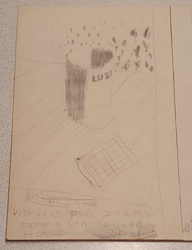 Dessin original au crayon de l'artiste belge Roger Raveel. Ce dessin provient du livre d'or du restaurant Lusitania (Ostende). Le restaurant existe toujours et est situé près du pilotage où l'artiste a également réalisé quelques peintures murales. Le dessin est daté du 15/05/1990. C'est la semaine après que l'artiste s'est promené dans Bruxelles avec son uvre 'Le sens du non-sens'. Le dessin est signé par l'artiste mais aussi (entre autres) par Zulma, Roland Jooris, Octave Scheire. L'authenticité du dessin a été confirmée par ce dernier. Le travail a été encadré derrière un verre résistant aux UV.