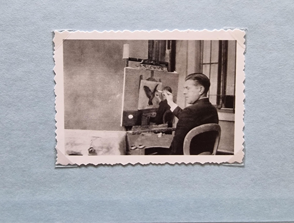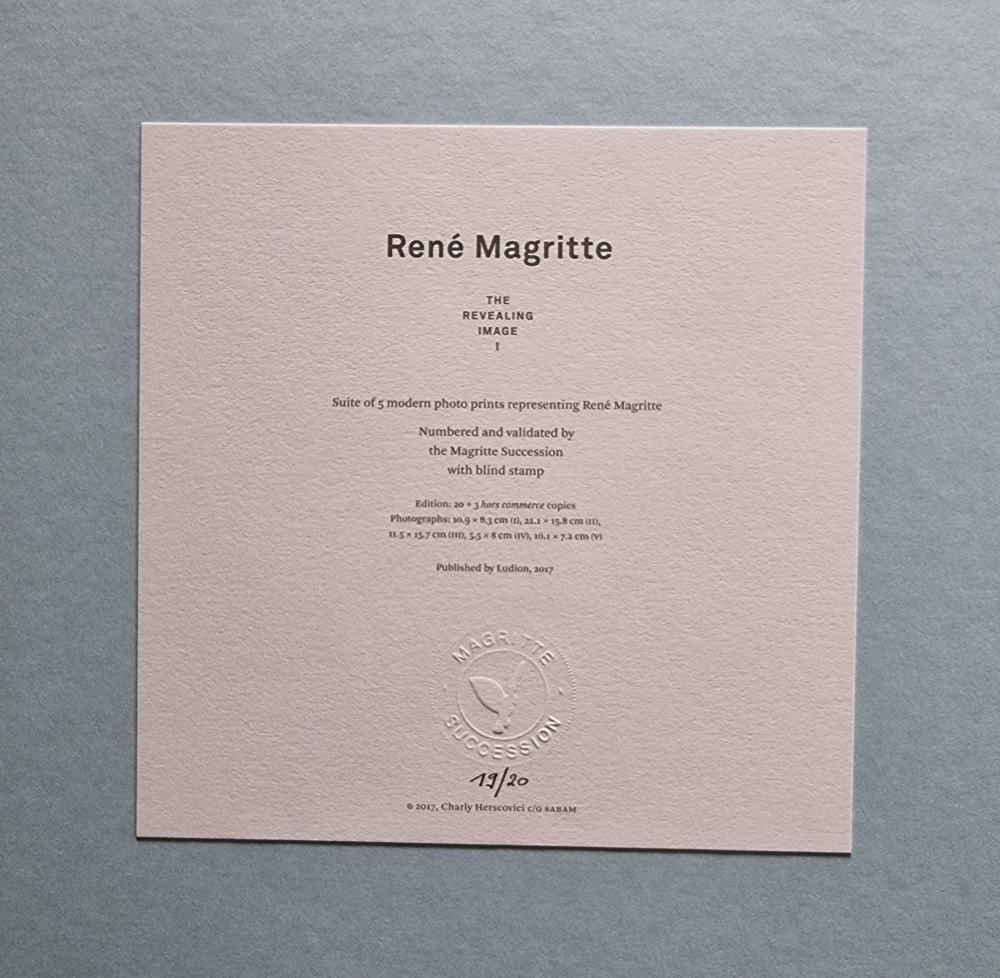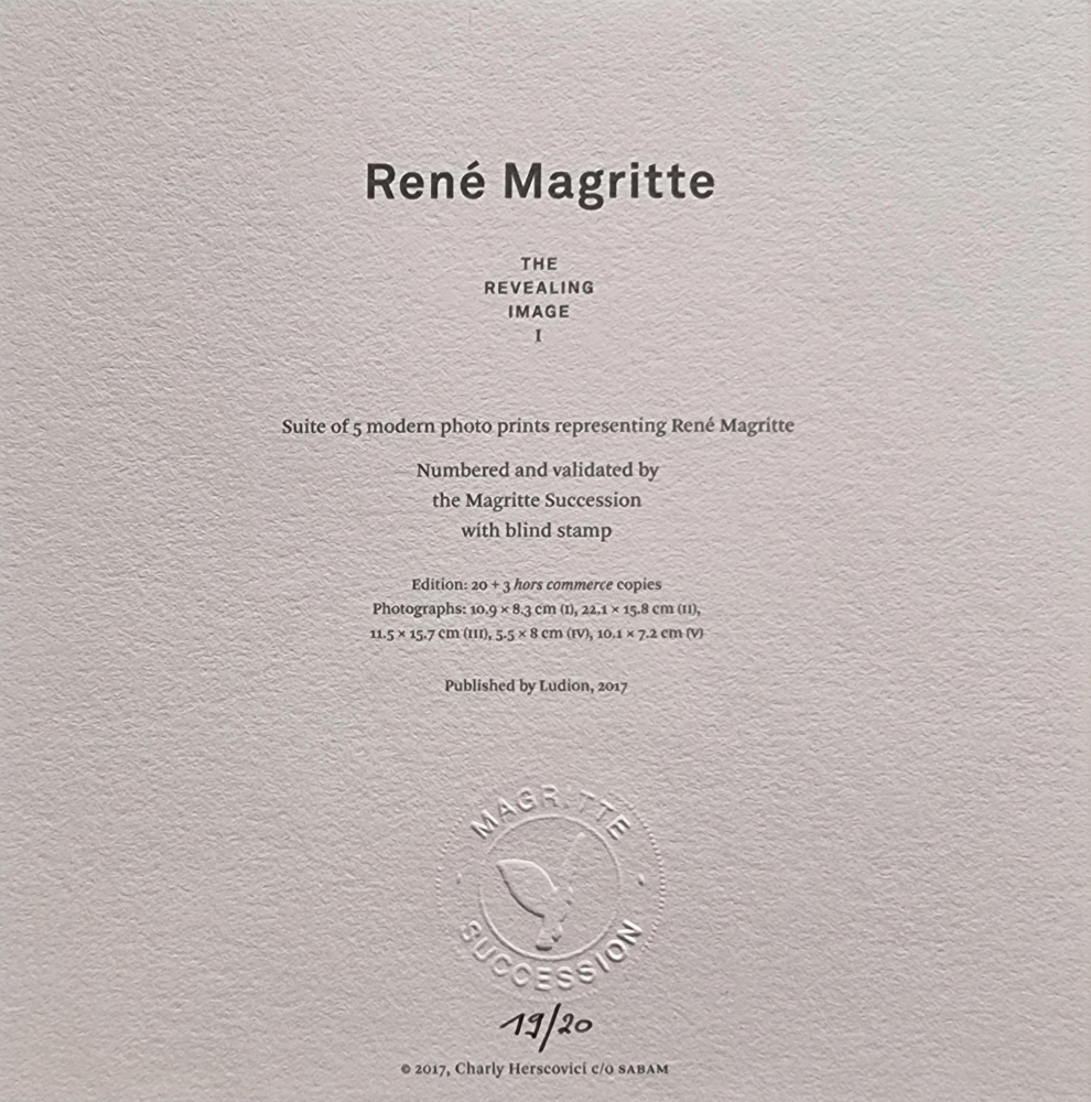 L'image révélatrice I René Magritte Suite de 5 estampes modernes d'après des tirages gélatino de René Magritte Numérotée et validée à sec par la Succession Magritte Édition de 20 + 3 HC Édition 2017 Cinq photos, basées sur des épreuves gélatino-argentiques originales, nous offrent un regard intimiste sur l'art du peintre. On le voit dans des scènes soigneusement mises en scène pour des chefs-d'uvre tels que Le Masque vide, L'Évidence éternelle et La Tentation de l'impossible. Dans une quatrième image, il pose pour une étude qu'il utilisera plus tard pour peindre. Sur la photo de 1928, qu'il appelle lui-même La Sainte Famille, René regarde dans l'objectif avec Georgette, amusé. Il tient un buste en plâtre dans ses bras, tandis que Georgette tient leur chien Loulou sur ses genoux. Ils semblent faire partie de la peinture au-dessus d'eux sur le chevalet. Les photos de cette édition sont des fac-similés basés sur des tirages gélatino-argentiques qui faisaient partie des archives photographiques de l'artiste. Chaque édition est numérotée et validée par la Succession Magritte avec un cachet sec