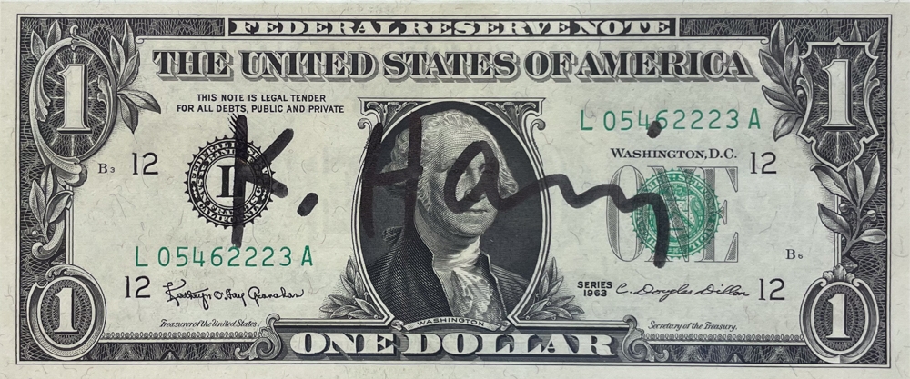 Billet d'un dollar original signé de Keith Haring. La note est signée mais non datée par Keith Haring. Le billet est en très bon à très parfait état et n'est pas encadré.