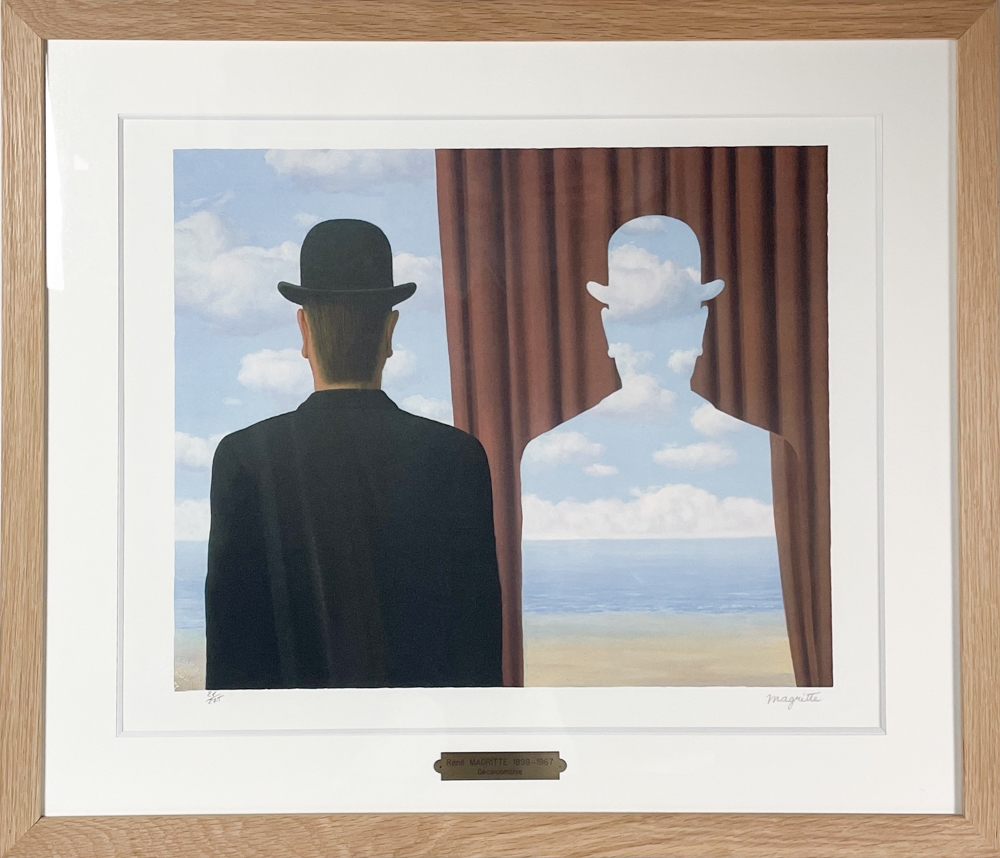 Top werk van René Magritte. Lithografie getekend en genummerd op 275 exemplaren. De lithografie bevat een stempel van de Fondation Magritte. Dit werk is ingelijst in een houten lijst en bevat een koper kleurig naambordje. Werk en lijst zijn in perfecte staat.