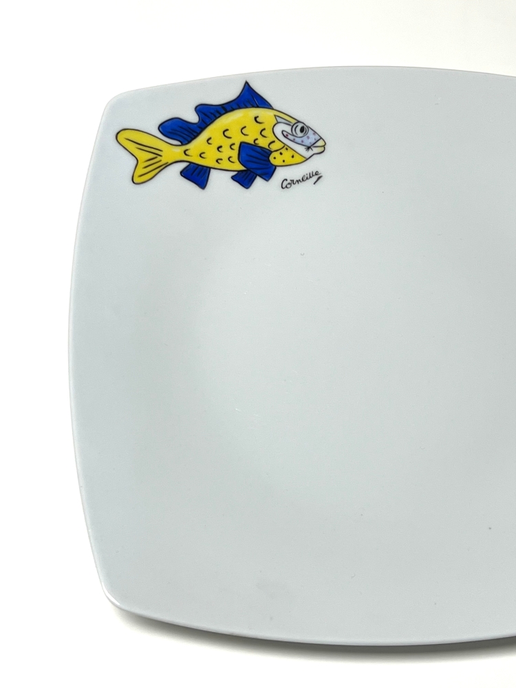 Superbe assiette "Poisson" peinte à la main par l'atelier de céramique de Corneille (1922-2010) dissous à sa disparition en 2010. Avec la mention aux dos : Exclusif pour Schana B Gallery - Dimensions : 29,5 x 29,5 cm - Hauteur : 2,5 cm - Lavage à la main Porcelaine de Limoges à multiples usages : plat de présentation ou plat de décoration Guillaume Corneille fut l'un des membres fondateurs du groupe Cobra avec Karel Appel, Asger Jorn, Christian Dotremont, Constant, Jacques Doucet, Simon Vinkenoog ou encore Alechinsky. Envoi sécurisé par UPS Exposition Cobra avec la plus grande collection américaine de Corneille à Miami au printemps et en été 2023. Rétrospective Corneille qui vient de se terminer ce 15 Janvier au Cobra Museum à Amstelveen. Sortie d'un timbre Cobra / Corneille chez Bpost en 2023 Bijoux Corneille exposés à la Fondation Boghossian jusqu'au 14 Mai 2023 (Ornamentum, Collection Diane Venet)