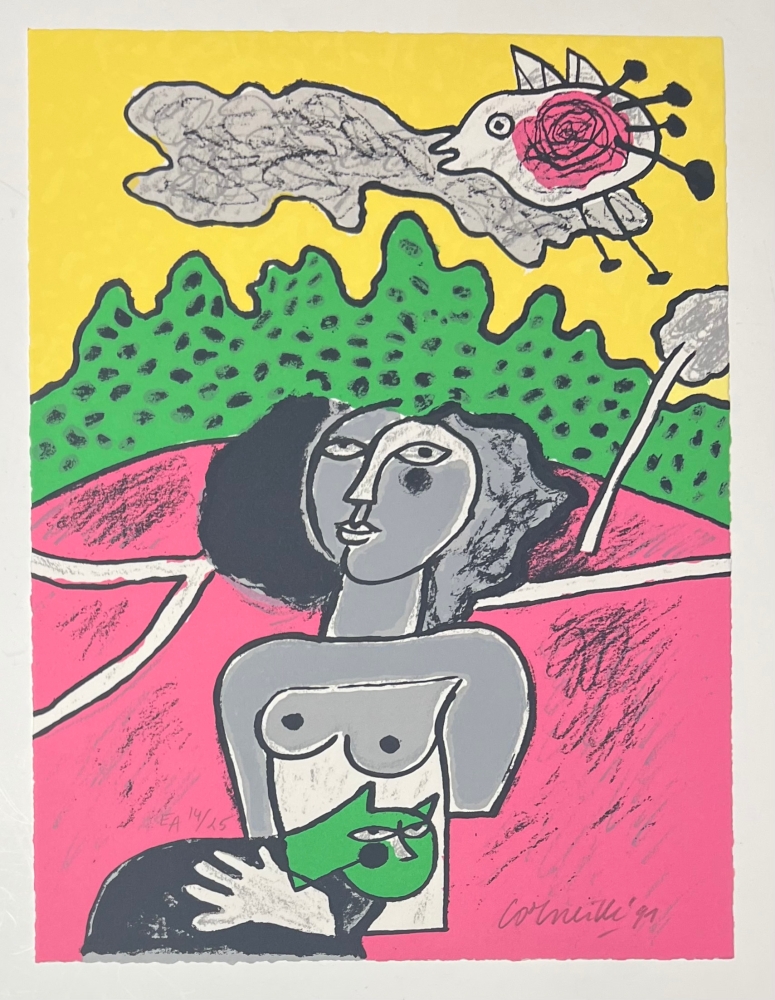Superbe lithographie, 40 x 30 cm. Exemplaire d'artiste EA 14/25 avec Tampon Atelier Corneille au dos. Signé et daté au graphite en bas par Corneille. Exposition des 75 ans de Cobra à partir du 1er Juin au Cobra Museum à Amstelveen. Ouverture du dépôt Cobra à Anvers en Juin 2023 Sortie d'un timbre Cobra / Corneille chez Bpost en 2023