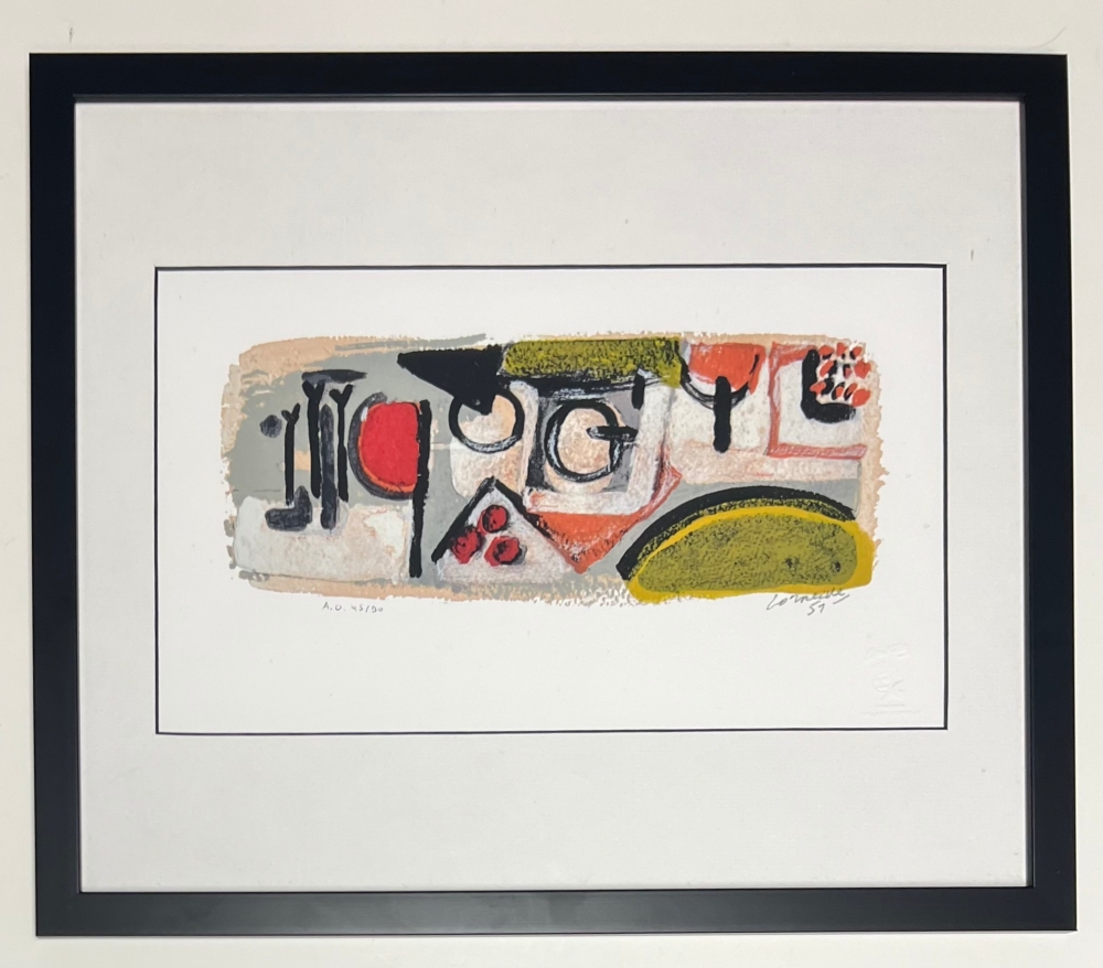 Belle oeuvre Cobra encadrée de Guillaume Corneille signée dans la planche, réalisée en hommage à Charlie Parker :" April in Paris", 1951. Corneille découvre le Jazz à son arrivée à Paris en 1951 dans les cabarets de la Capitale. Avec Hugo Claus, il a l'idée de travailler autour de cette musique. Tirage autorisée à 90 exemplaires d'après la sérigraphie originale "April in Paris" - Schana B Editions / Archives officielles Guillaume Corneille - Tampon au verso de l'image - Pigments naturels sur papier de chanvre Belge. Tirage numéroté. Timbre à sec des éditions Nous vendons ici l'exemplaire numérotée AO 45/90 - Décentrement de l'image imaginée par Corneille suggérant l'arythmie du Jazz. Le peintre a créé en totalité 8 oeuvres dans la série "April in Paris" en 1951. Dimensions avec cadre : 39 x 46 cm Parfait état. Exposition Cobra avec la plus grande collection américaine de Corneille à Miami au printemps et en été 2023. Rétrospective Corneille qui vient de se terminer ce 15 Janvier au Cobra Museum à Amstelveen. Sortie d'un timbre Cobra / Corneille chez Bpost en 2023 Bijoux Corneille exposés à la Fondation Boghossian jusqu'au 14 Mai 2023 (Ornamentum, Collection Diane Venet)