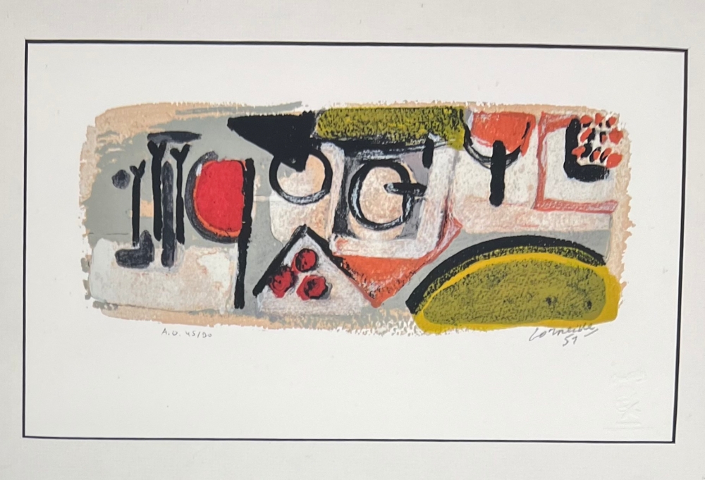 Prachtig ingelijst Cobra-werk van Guillaume Corneille gesigneerd in de plaat, gemaakt als eerbetoon aan Charlie Parker:" April in Parijs", 1951. Corneille ontdekte de jazz toen hij in 1951 in Parijs aankwam in de cabarets van de hoofdstad. Met Hugo Claus kwam hij op het idee om rond deze muziek te werken. Geautoriseerde oplage van 90 exemplaren van de originele zeefdruk "April in Paris" - Schana B Editions / Guillaume Corneille Official Archives - Stempel op de achterzijde van de afbeelding - Natuurlijke pigmenten op Belgisch henneppapier. Genummerde editie. Droogstempel van de edities Wij verkopen hier het genummerde exemplaar AO 45/90 - Off-centering van de afbeelding bedacht door Corneille die de aritmie van Jazz suggereert. De schilder maakte in totaal 8 werken in de reeks "April in Parijs" in 1951. Afmeting met lijst : 39 x 46 cm Perfecte staat. Cobra tentoonstelling met de grootste Amerikaanse collectie van Corneille in Miami in voorjaar en zomer 2023. De Cobra-retrospectieve in het Cobra Museum in Amstelveen is net afgelopen op 15 januari. Uitbrengen van een Cobra / Corneille postzegel door Bpost in 2023 Sieraden van Corneille tentoongesteld bij de Boghossian Stichting tot 14 mei 2023 (Ornamentum, Collectie Diane Venet)