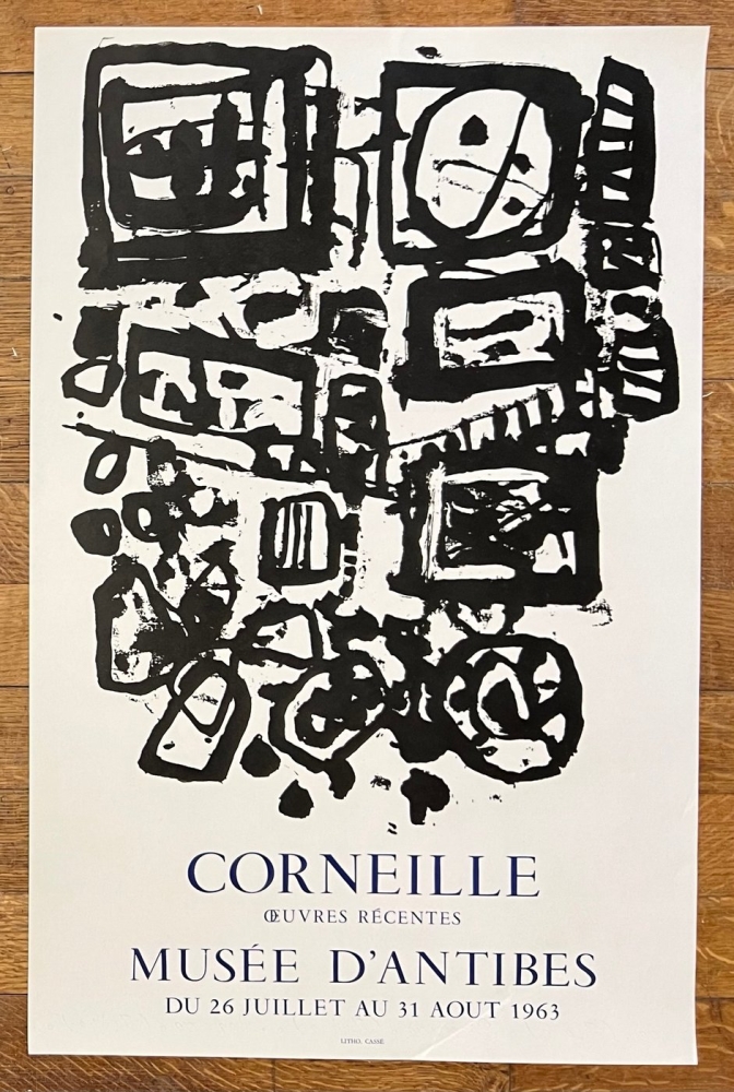 Affiche voor een historische tentoonstelling in het Musée d'Antibes (nu het Musée Picasso). Let op: één van onze laatste exemplaren! Met Atelier Corneille stempel op de achterzijde. Zeer frisse staat van het papier met lichte kreukels onderaan. Schitterende litho poster van Guillaume Corneille, stichtend lid van de COBRA groep met Asger Jorn, Karel Appel, Dotremont, Constant en later Alechinsky, Jacques Doucet en Hugo Claus. Corneille Recente werken Museum van Antibes Van 26 juli tot 31 augustus 1963 Litho 65 x 42 cm - Gedrukt door Michel Cassé Catalogus raisonné Donkersloot n°154