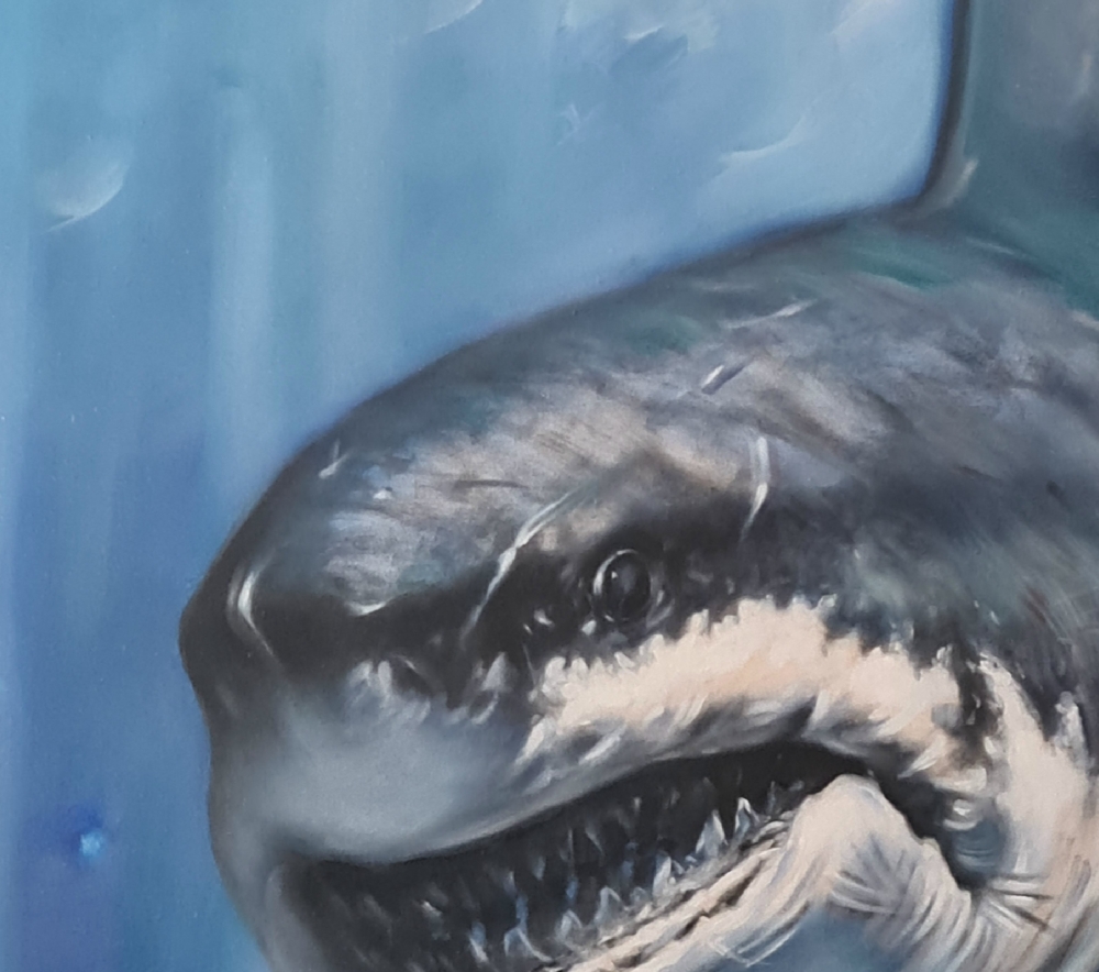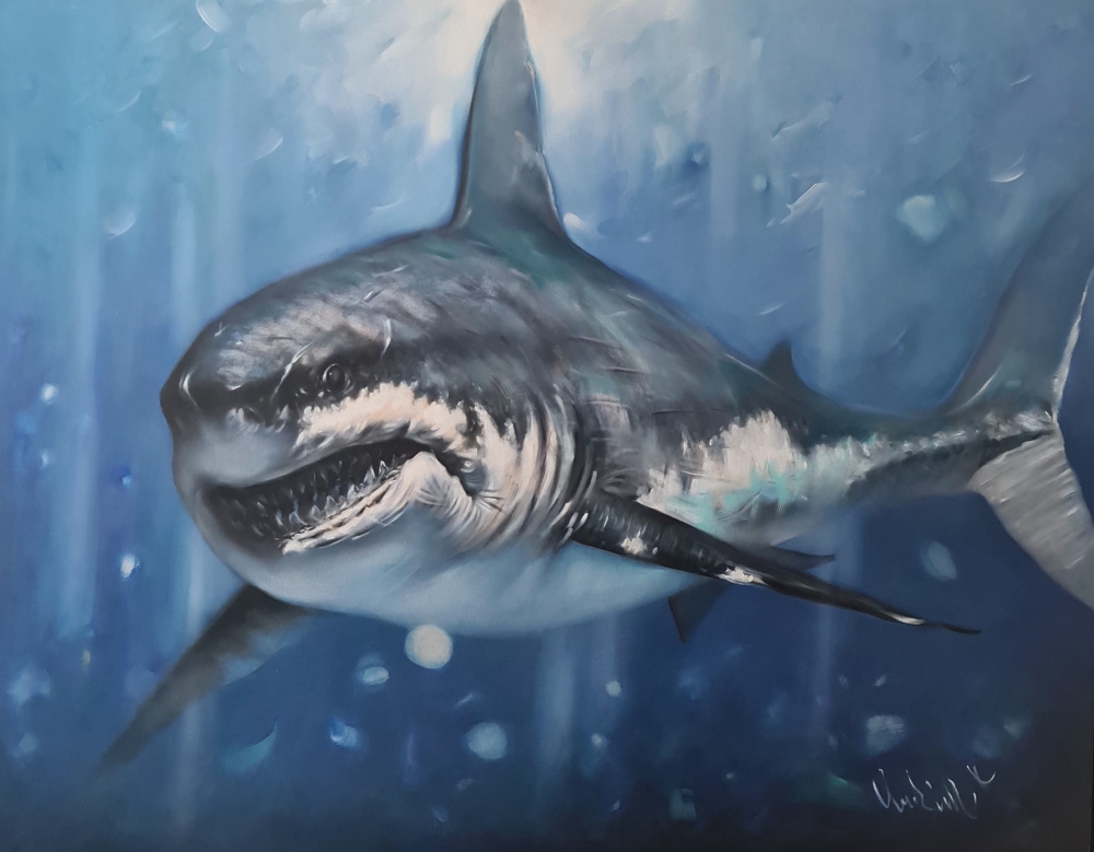 De vraag was nu of deze haai een onschuldige omstander of een speler was... Vadim Kovalev demonstreert in zijn kunst een intrigerende synthese van de taal van de moderne popcultuur en de traditionele schilderkunst. Elementen van het surrealisme in Kovalevs schilderkunst worden afgewisseld met een sentimentele sensualiteit, gekleed in een effectieve en kundige beeldtaal. Zijn schilderijen creëren een visueel krachtig verhaal dat de kijker het digitale tijdperk in trekt en enkele onbekende aspecten van de moderne cultuur onthult. Het maakt indruk met zijn stilistische diversiteit en het vermogen om vrij te bewegen in de tekens en technieken van het schilderen. Hij is zonder twijfel een romanticus, want de wereld die hij afbeeldt bestaat niet. en nooit heeft bestaan, het is een ontsnapping die inherent is aan de romantiek over de zelfgecreëerde ruimte van de geest, de zoektocht naar het onderbewuste ideaal.