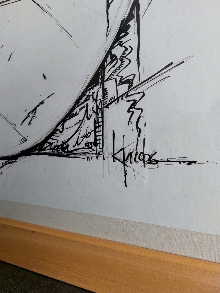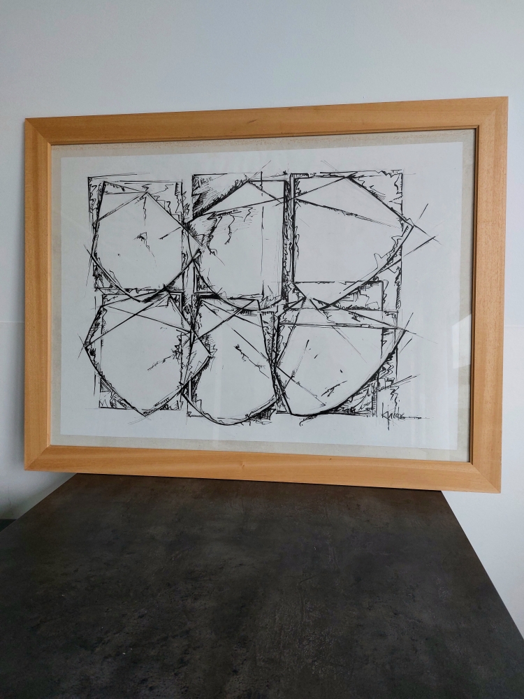 Dit werk is er eentje uit mijn beginjaren, ingekaderd en voorzien van een ophangsysteem. De inspiratie voor deze pentekening komt van een project waar ik zes vazen in keramiek maakte. De vormen van mijn vazen boeiden me zo dat ik ze in contact met elkaar bracht. Elk op zichzelf en toch samen. De verbindende factor zijn de lijnen die over de grens van de individuele vorm durven treden. Ze ontdekken dat contact zoeken en vinden ook wat van belang is. Het vormen van een groep wat ons erkenning en herkenning geeft. Wat een gevoel van thuis kan geven. Een thuis waar je kan zijn wie je bent. Even alleen en toch ook samen. De speelse lijnvoering en de verborgen figuren die deel uitmaken van het geheel zijn een voorbode van mijn traject dat ik nu heb als illustrator. De liefde voor een schetsende speelse lijn, het vatten van een verhaal dat uitgewerkt is in een beperkt kleurenpalet. Tot op de dag van vandaag is dit nog steeds terug te vinden in mijn recent werk. Ik ben mama van 3 kinderen en lerares Beeld. Als klein meisje was geen enkel oppervlak veilig. Ik tekende overal waar ik maar kon, zelfs op de muren. Het leven neemt soms rare wendingen, vandaar dat ik pas vrij laat mijn passie achterna heb gegaan. Elf jaar geleden startte ik de opleiding Illustratieve Vormgever in Sint-Niklaas, SASK (2012). Ik studeerde af in 2018. Ondertussen heb ik al een aantal toffe projecten gerealiseerd waaronder het illustreren van 7 prentenboeken. Stap voor stap bewandel ik mijn pad als mama illustrator leerkracht. Vanuit het gegeven dat alles mogelijk is, focus ik me op het nu om zo open te staan voor wat nog komen zal. Ondertussen geniet ik van elke stap die ik neem. www.katrijnjacobsillustrator.be