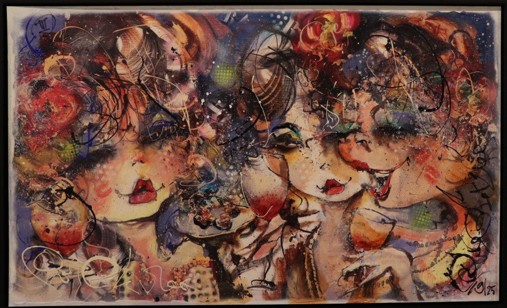Een fraaie mixed-media kunstwerk gemaakt door kunstenaar Guy Olivier. Het betreft een afdruk op handgeschept papier, waarna de kunstenaar elk exemplaar uit de serie van 25 stuks met de hand heeft beschilderd. Het kunstwerk is zwevend ingelijst in een zwarte baklijst.