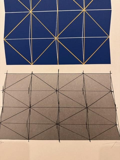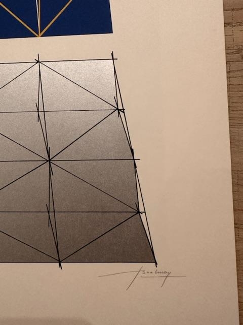 Zeefdruk van Jan Beekman gesigneerd en genummerd op 250 exemplaren. Jan Beekman is een schilder, pastellist, beeldhouwer. Ontwikkelde zich van sterk geometrisch constructivisme naar een meer lossere, soms haast organisch geïnspireerde vormgeving. Studeerde aan de Academie te Brussel en Antwerpen. Prijzen: Europaprijs van de Schilderkunst en Prijs van de stad Oostende (goud). Leraar aan het Centrum voor Hoger Kunstonderwijs te Brussel. Vestigde zich in de V.S. Tentoonstellingen: 1973 Begisches Haus, Koln, 1983 Museum of Modern Art, Ann Arbor, Michigan (USA), 1990 Lineart, Gent, 1994 PMMK, Museum voor Moderne Kunst, Oostende, 1995 Botero and other prominent European Masters, 2000 Alex Gallery, Washington Amerikahaus- Munchen, Art Chicago, 2002 Stichting Veranneman, Kruishoutem Alva Gallery (New London) USA. Litteratuur: Jan Beekman, Brugge 1994.Stichting Kunstboek Werk in musea te: Paleis voor Schone Kunsten ( Brussel) Museum voor Hedendaagse Kunst ( Brussel) Museum of Modern Art (Michigan), Museum voor Moderne Kunst (Oostende).
