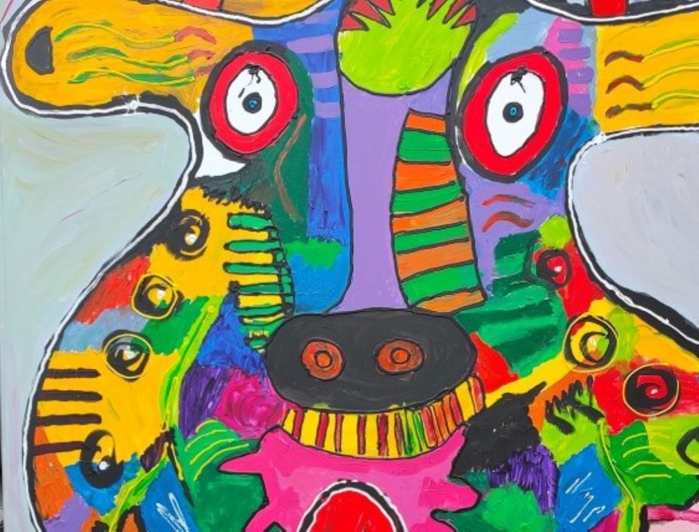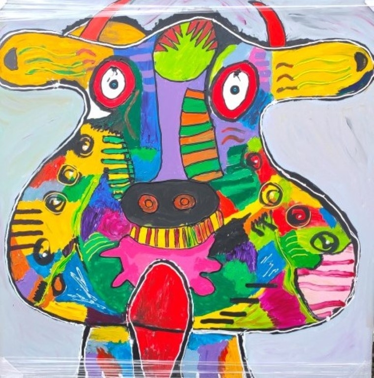 Hiermede een crazy COW , is gemaakt met acryl verf , een werk met een mooie maat , 150x150x4cm , voor een ruime kamer of kantoor , waar ook met een goed gevoel gewerkt moet worden , na kennis gemaakt te hebben , onafscheidelijk voor iedereen