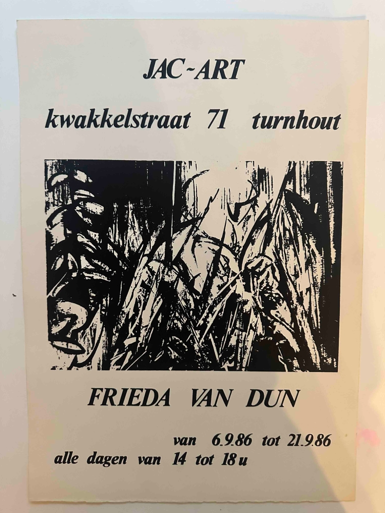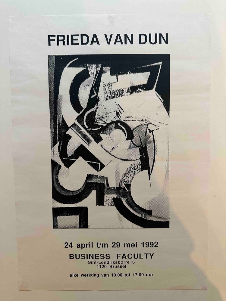 4 affiches van Frieda Van Dun Frieda Van Dun (Weelde 1951) woont en werkt in Antwerpen. Zij heeft reeds gedurende drie decennia menigvuldige contacten met de kunstenaars rond de galerie De Zwarte Panter. Over haar boeiend oeuvre heeft de essayist-dichter Roger de Neef een indringende tekst geschreven in een prachtig boek De weg naar beweging, Uitgeverij P-Leuven, Vrienden van De Zwarte Panter- Antwerpen, 2011.