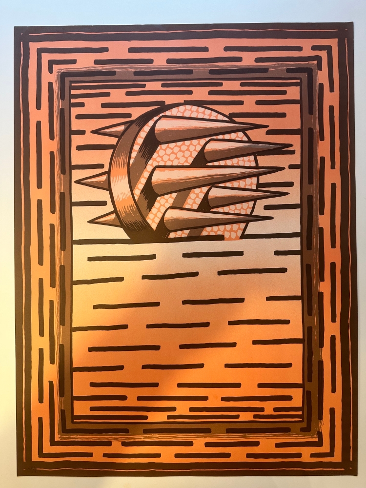 Prachtige litho met de hand gesigneerd en genummerd. Walter Goossens is een Belgische kunstenaar die geboren is in 1943 te Lier. Hij is een schilder. Opleiding aan de Academie te Antwerpen o.l.v. F. Van Loock en K. De Roover, aan het Hoger Instituut te Antwerpen. Monumentaal, burlesk of sober, ironisch en soms surrealistisch spot hij met zichzelf en de wereld. Zijn tentoonstelling in 1974, Het spiegelpaleis van de kermis, bestond uit een reeks vervormde zelfportretten. Een ander thema dat vaak behandeld wordt is de angst voor de gemechaniseerde wereld in de vorm van dreigende technologische monsters. Uit de pers: W.G. heeft lange tijd het zelfportret als onuitputtelijke inspiratiebron gebruikt, maar daarvan is hij nu flink afgeweken. Hij schildert niet voor de burger, maar manifesteert zich sterk en heftig in zijn kunst. Het is de dood, of beter de symbolen van de dood, die hem voor zijn tekeningen, papieren knipwerk, schilderijen ene draadsculpturen inspireren. Kruisen en kransen vormen de elementen waarmee W.G. zijn aangrijpende getuigenis opbouwt. (R.C.C., 1982) Stelde o.m. tentoon in de galerie De Zwarte Panter te Antwerpen in 1982. Werk aangekocht door de Staat in 1982/1983. Vermeld in BAS I,II en Twee eeuwen signaturen van Belgische kunstenaars
