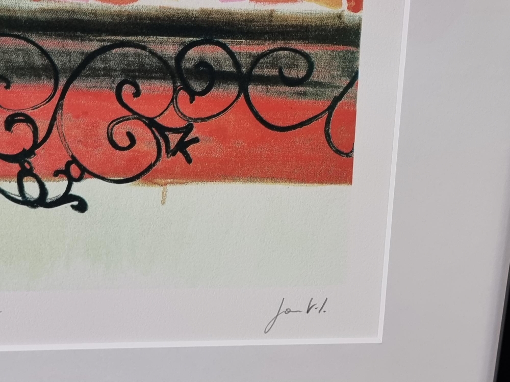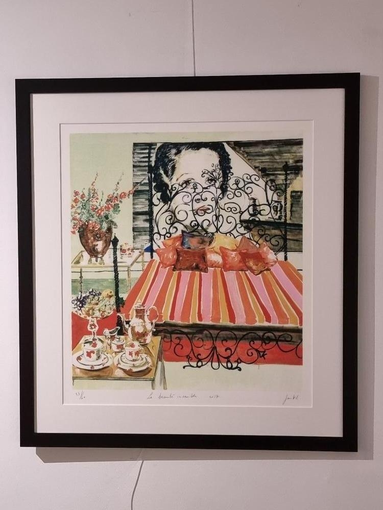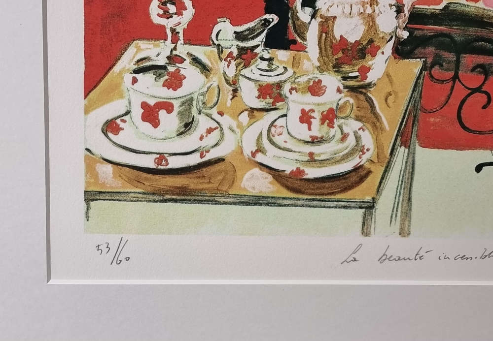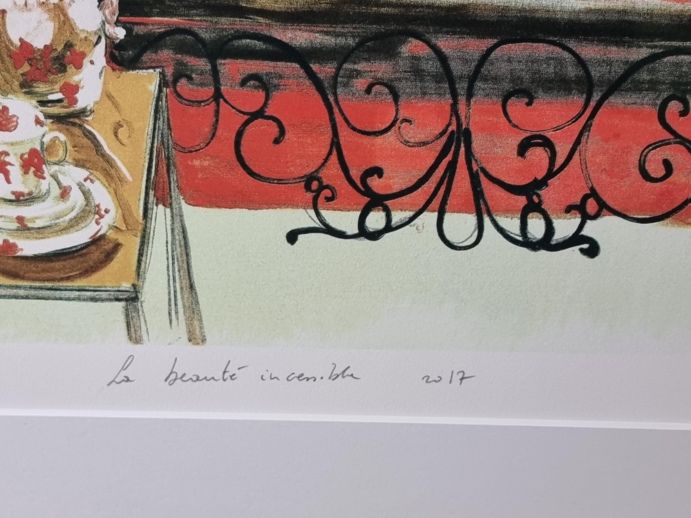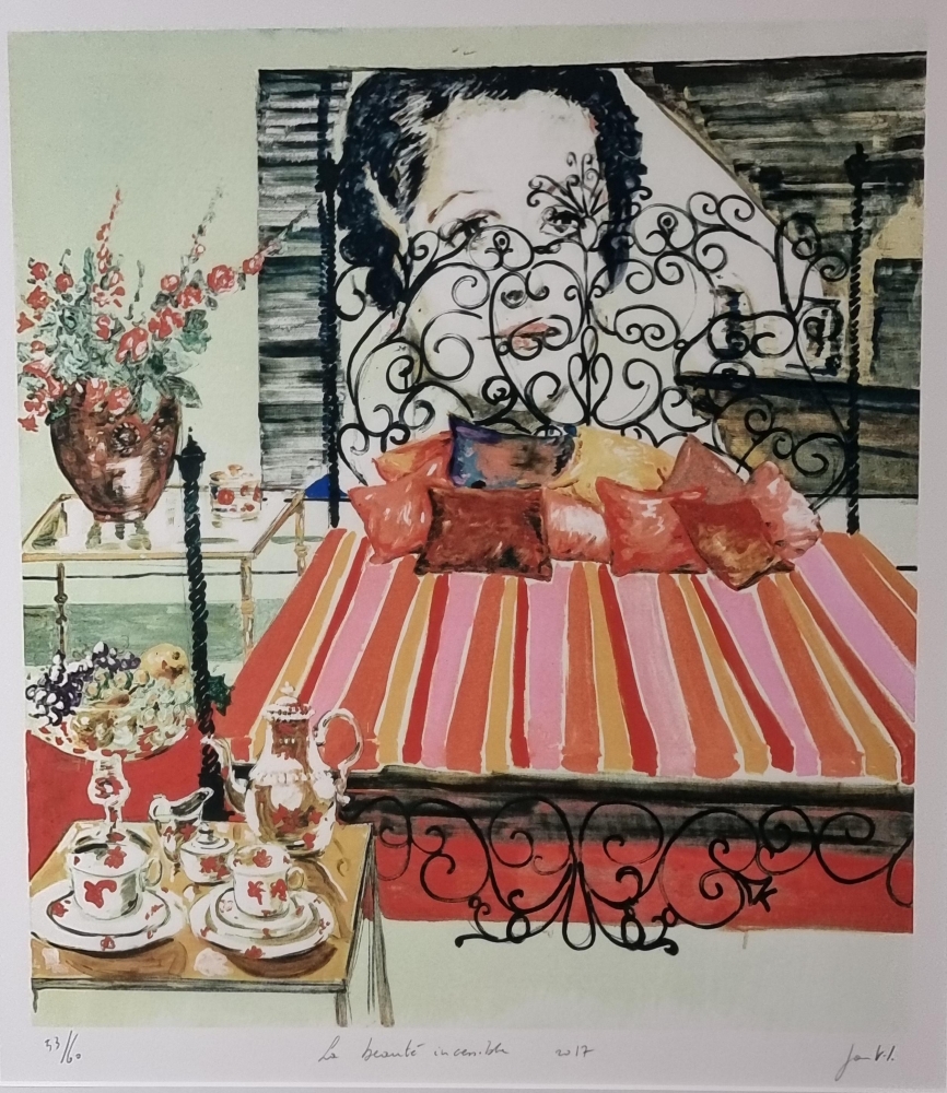 Van 7 oktober 2023 tot 3 maart 2024 loopt in het SMAK (Gent) 'The End Is Never Near', de eerste overzichtstentoonstelling gewijd aan het werk van de Belgische kunstenaar Jan Van Imschoot. La beauté incessible - Jan Van Imschoot Originele zeefdruk op BFK Rives 250 g lompenhoudend, handgeschept papier Gedrukt bij Seriart, in samenwerking met Roger Vandaele, Antwerpen Oplage van 60 - genummerd (het aangeboden nummer kan verschillen van de foto), gesigneerd en getiteld Het werk is in mint conditie. La beauté incessible (de onoverdraagbare schoonheid) is gebaseerd op Jan Van Imschoots schilderij The End uit 2008. Voor dit werk liet de kunstenaar zich inspireren door de films van cineast Luis Buñuel. Net als de surrealistische filmmaker speelt hij met de grenzen tussen werkelijkheid, verbeelding, herinnering en fantasie. Ofschoon we ons in een knus en burgerlijk interieur bevinden doet de kamer bevreemdend aan, omwille van het enorme portret van Catherine Deneuve die de hoofdrol speelde in Buñuels Belle de Jour en Tristana. Het portret aan de muur toont Deneuve in al haar menselijkheid, maar ook op een moment waarin ze aan de diepste gevoelens van haar personage gestalte geeft. Het Spaans-oriëntaalse bed is een knipoog naar Buñuel, terwijl de bloemen, het fruit en de koffietafel teruggrijpen naar de stillevens uit de Vlaamse barok taferelen die zowel rijkdom als erotiek en vergankelijkheid uitbeelden.