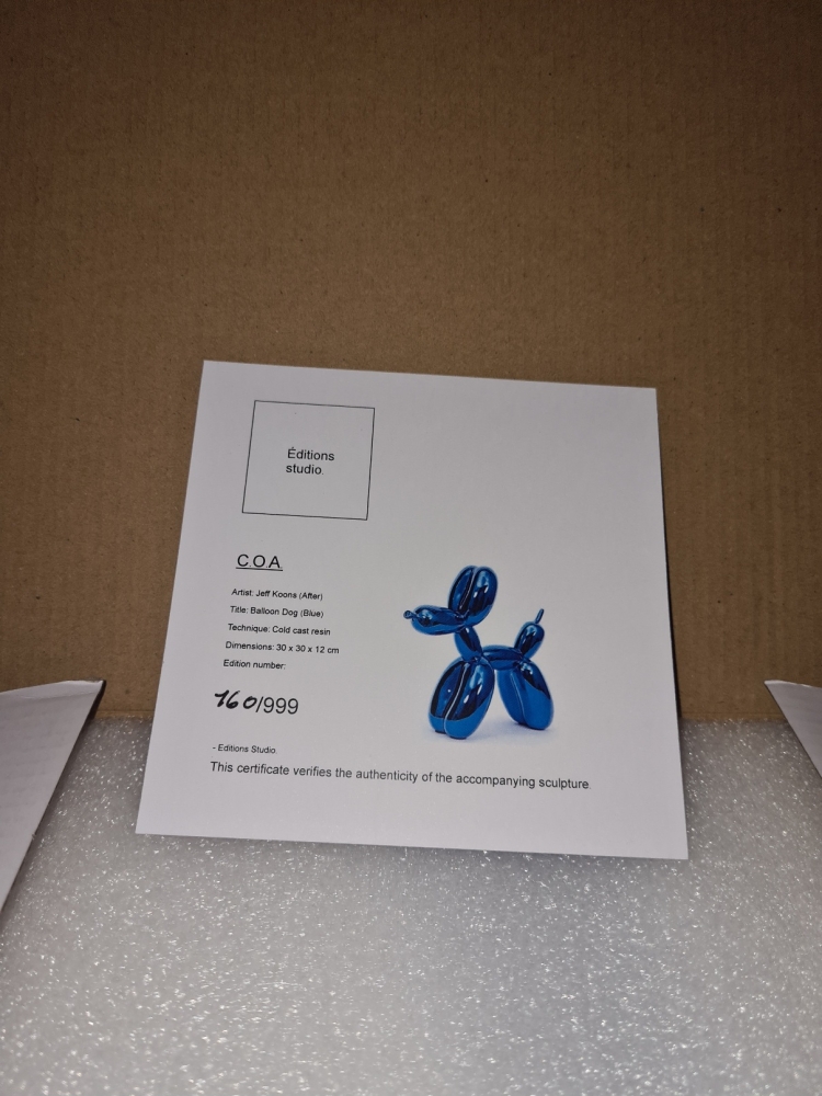 Balloon Dog Jeff Koons -Editions Studio- Is gemaakt in oplage van 999- Inclusief certificaat, nummering en originele doos- Editions Studio- Afmetingen : 30x30x12cm- In uitstekende nieuwstaat Enkel uit de doos genomen om foto's te trekken.