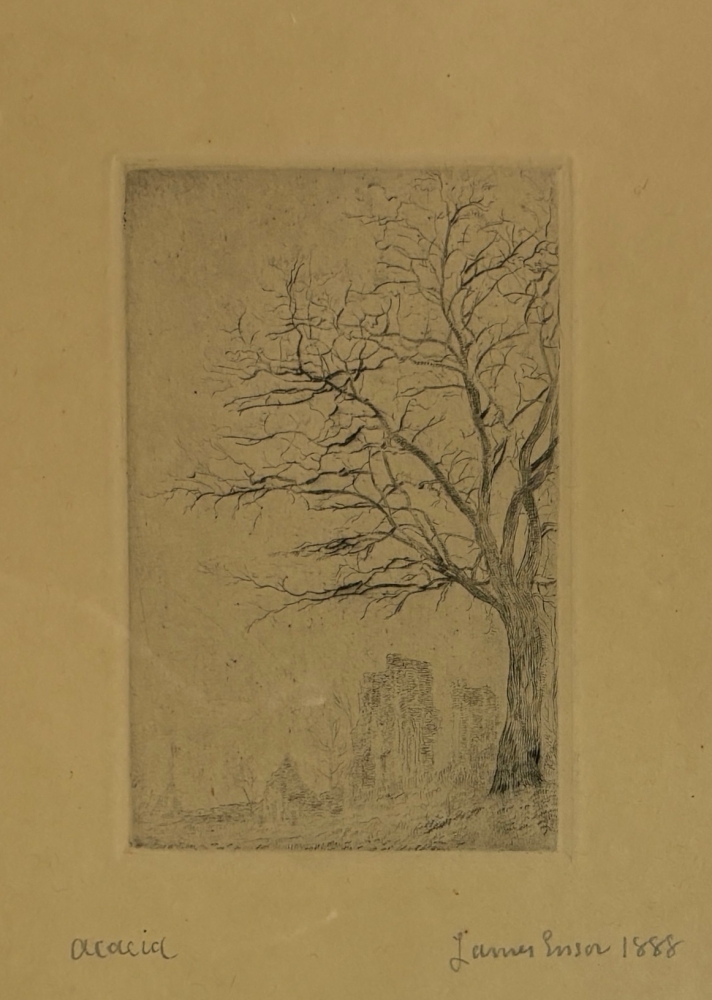 Gesigneerde, gedateerde en getitelde ets Acacia door Belgisch kunstenaar James Ensor. Gesigneerd, gedateerd en getiteld in potlood. Professioneel ingelijst. Provenance; oude collectie Augusta Bogaerts, een van de personen die het kortst bij James Ensor stond tot het einde van zijn leven. Met documentatie. Verzekerde verzending alsook ophalen mogelijk.